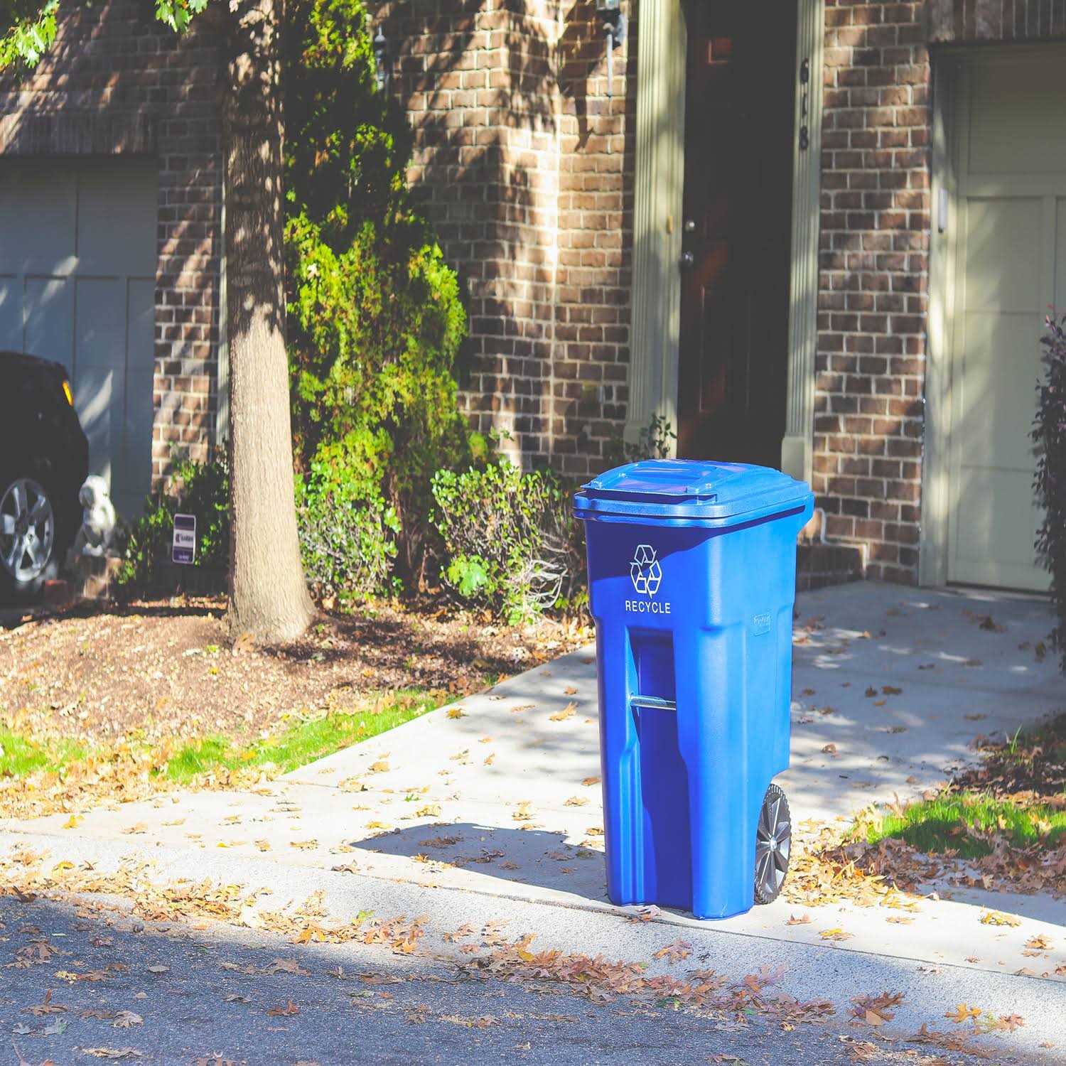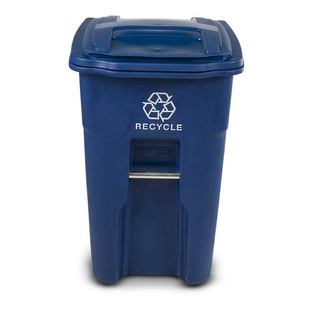 Recycle trash can with (2) 10 In. diameter, heavy-duty wheels for mobility over rough terrain. Ideal for yard waste, storage, construction clean up, material handling, or any number of tasks. Carts can lay flat for convenient loading of items. Large comfortable handle yields greater control when transporting. Ample handle areas accommodate working with protective gloves. Features an attached lid. Medium density polyethylene construction with up to 50% recycled content. Rotationally Molded for greater durability, longer life, and ease in cleaning. Fully recyclable.