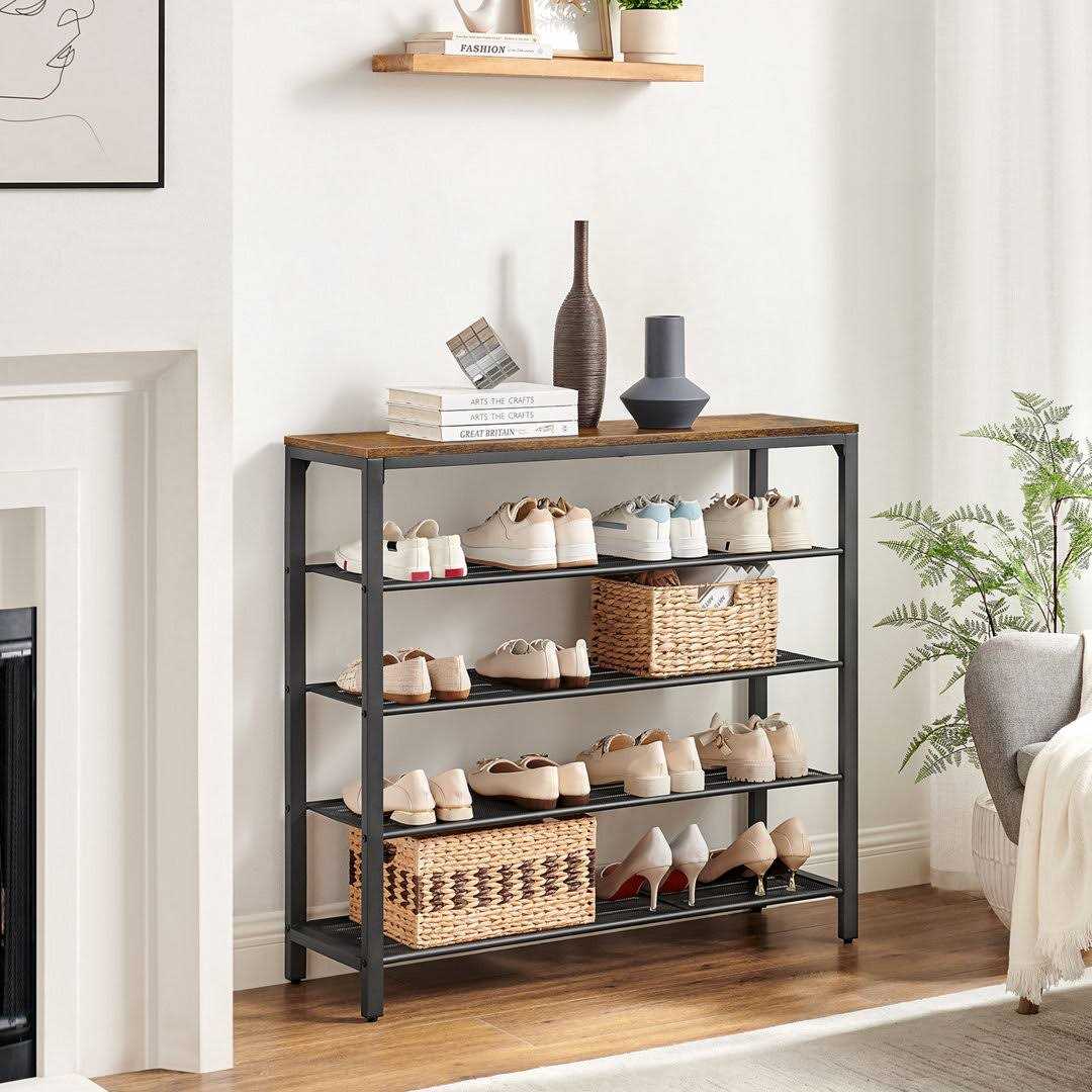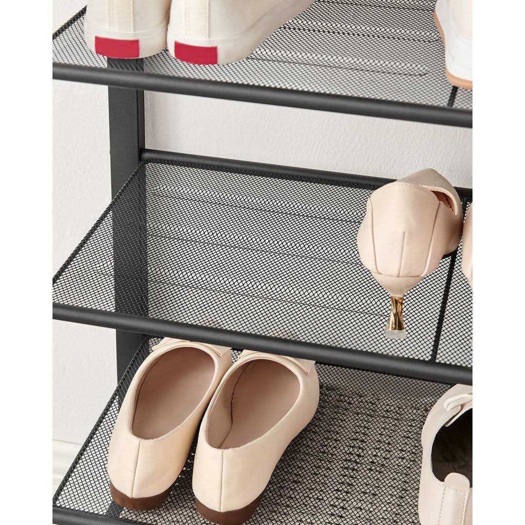 Ebern Designs For shoe collectors and families alike, this 5-tier metal shoe rack has room for 20-25 pairs of shoes in your hallway, closet, or bedroom. The rustic brown top can be a perch for your keys, bags, and more. For heels, the dense mesh shelves won’t let the heel slip through keeping them safely where they belong.