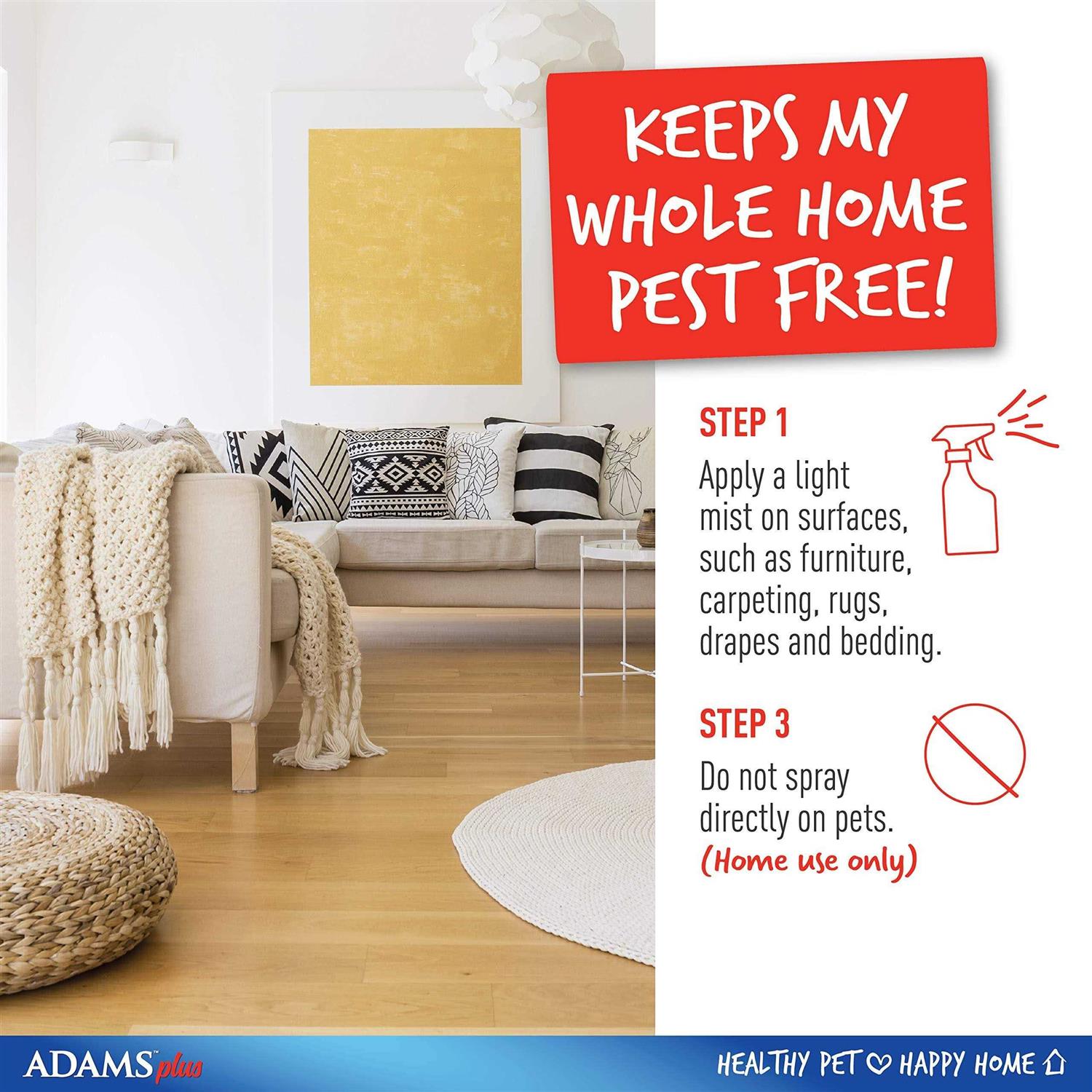 Adams Flea and Tick Home Spray contains a unique combination of ingredients that kills pre-adult fleas before they grow up to bite. It reaches fleas hidden in carpets, rugs, upholstery, and pet bedding. It protects your home from flea build up, while protecting your pets and family from bites. Use in homes, garages, attics and apartments. One treatment gives continuous protection against pre-adult fleas for 7 months. Kills fleas, ticks, mosquitoes, cockroaches, ants, earwigs, silverfish and other labeled insects.