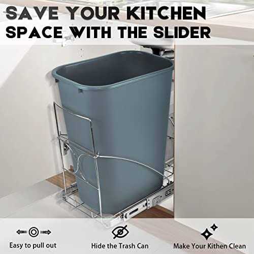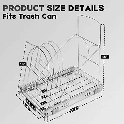 Pull Out Cabinet Trash Can:Pull-out sink trash can rack is perfect for kitchen and under pantry cabinets. With this trash can cabinet pull-out rack, you can nicely hide the trash can without losing floor space. Easy to Install: Please measure the size of your cabinets before purchasing to make sure the shelves fit your cabinets.Pull Out Trash Can Shelf dimensions measure 16 inch height × 12 inch width , Its simple design and easy installation instruction make your installation successful quickly. so you just need to fix the base with 4 screws. you will get a entire pull out organizer for cabinet. PREMIUM GRADE CONSTRUCTION: Made of heavy-duty steel with a chrome finish, the sliding rack is built to last for years. Because of the ball-bearing track system in place, twith ball-bearing gliders allows for a smooth and secure sliding motion each time you pull out and push in the trash bin. Designed to fit any style of cabinetry and easy to clean. Its heavy duty construction design makes it totally capacity up to 100 lbs. Adjustable Shelf Fitted Your Trash Can:The trash can rack is available in 4 adjustable sizes to fit most trash cans. The smallest size is 11 inches and the largest is 15 inches. (from 7 gallons to 10 gallons. )Note that the TRASH CAN IS NOT INCLUDED. – The versatile design fits most undercounter spaces in kitchens, bathrooms, pantries, and laundry rooms. /p