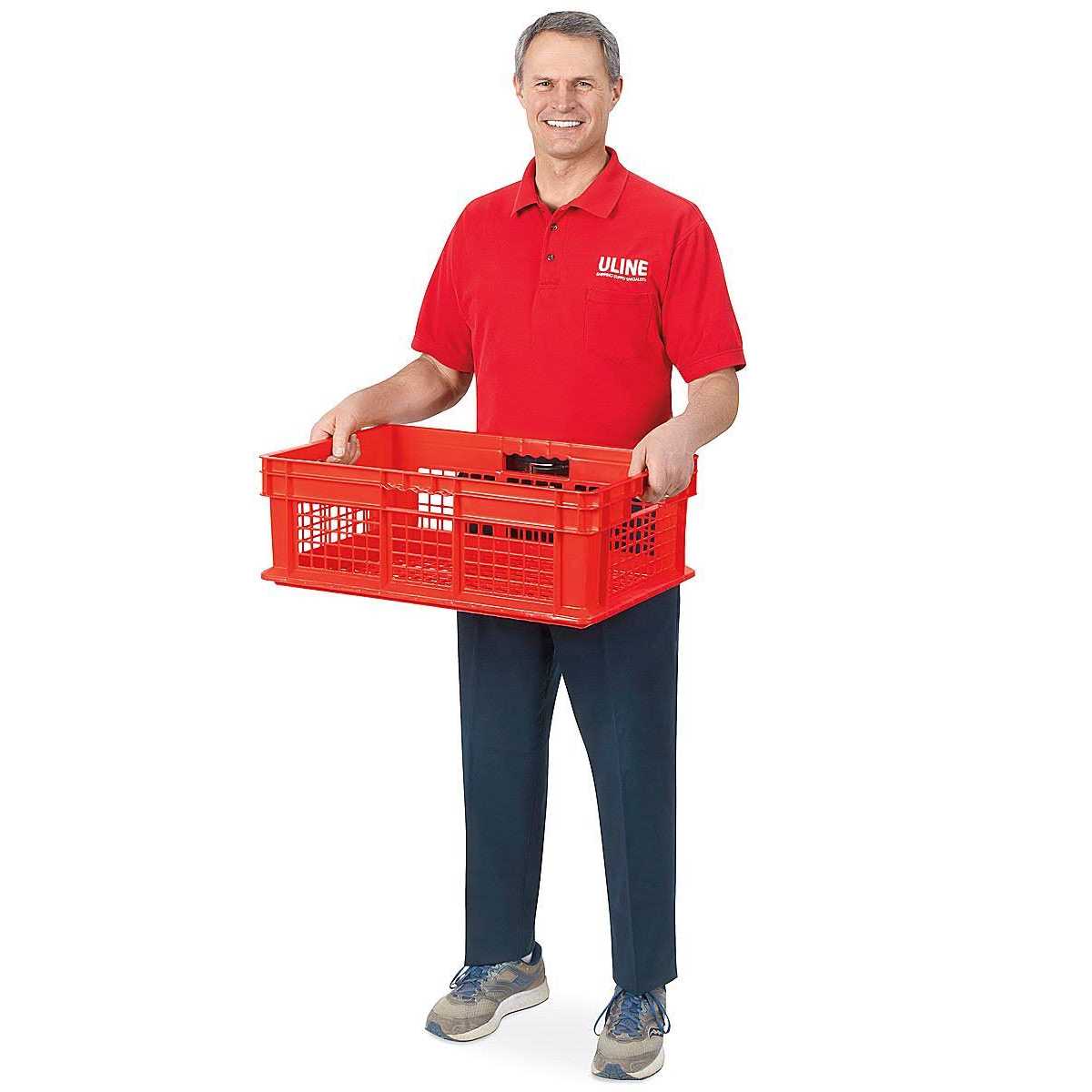 Mesh Straight Wall Containers – 400 Lb. Mesh bottom and sides provide drainage, airflow and content visibility. Polyethylene resists cracks, dents and chips. Molded handles on all 4 sides for easy carrying. Fully cube out 48 x 32″ pallets.