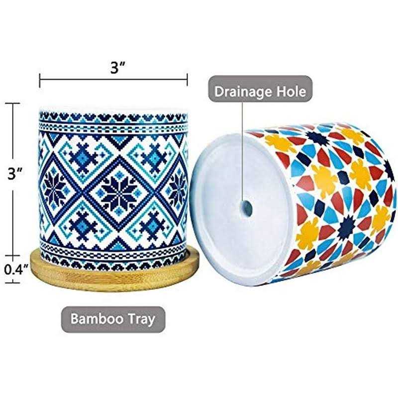 Color: **B Style** **Package include:** Ceramic Pot x 6 Bamboo Tray x 6 **Plants are NOT included** Material: Top ceramic Pots Dimension: 3 x 3 x 3inch (L x W x H) Bamboo Tray Dimension: 3.6 x 3.6 x 0.4inch (L x W x H) **Notice: The pots are suitable for small plants. ** **Feature:** **Mandala colorful paint pots:** stylish design pots, ceramic planter for succulent cactus have strong and slippery surface can prevent scratching. **Drainage Hole:** Drainage hole prevents the flower pot from overwatering, help your plant stay healthy. **Bamboo Trays:** Slightly raised edge, which is good for collecting excess water and soil spillage.