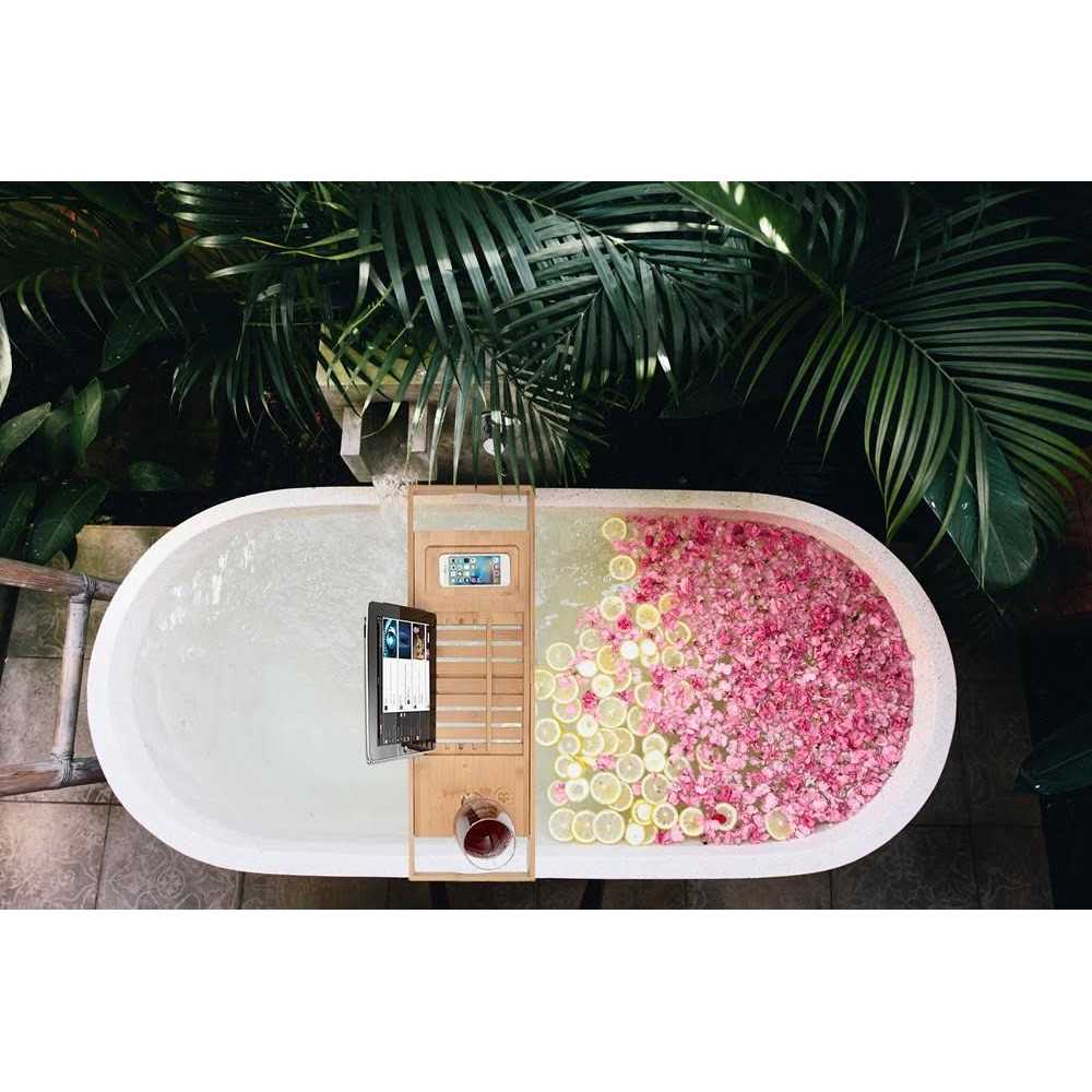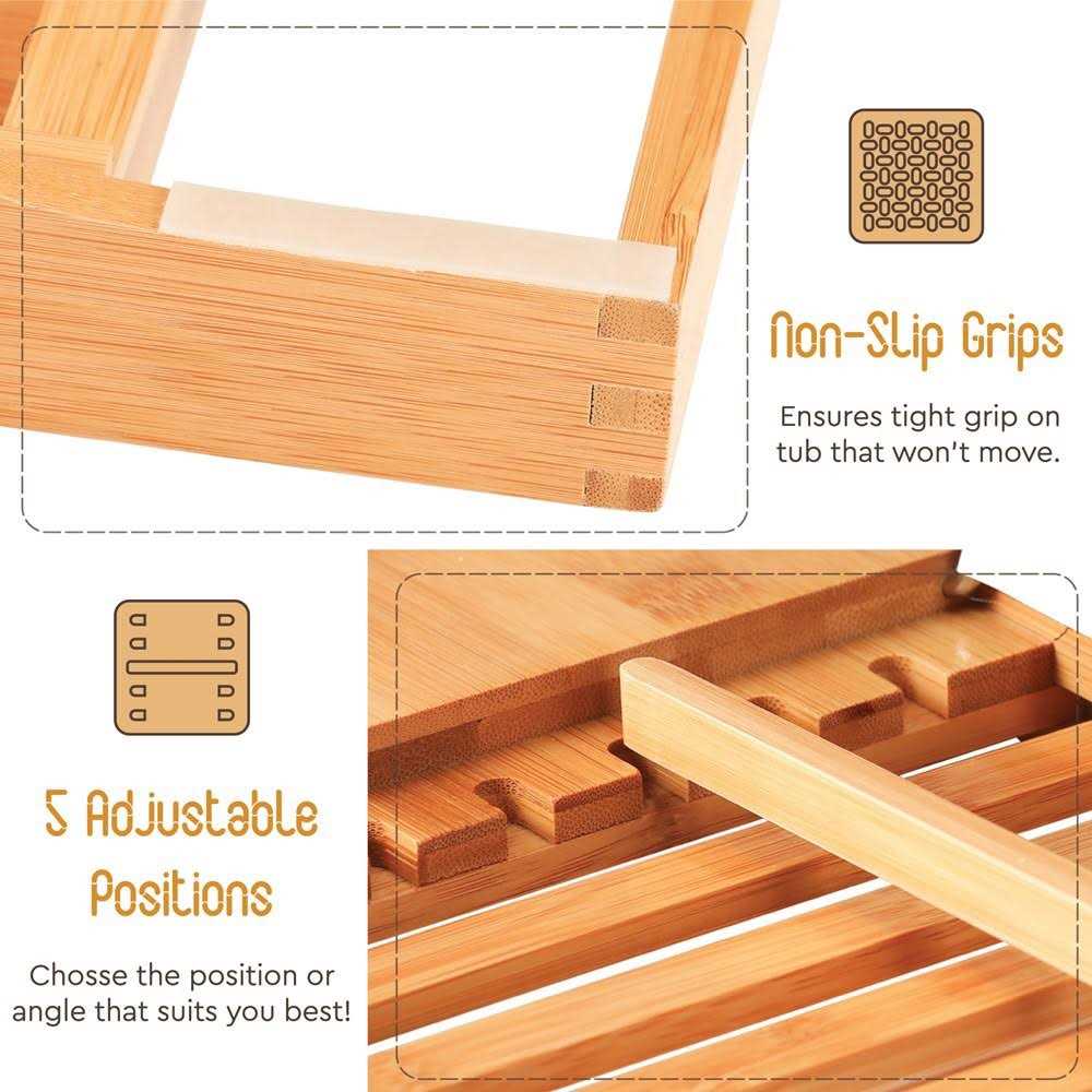 Bambusi Bathtub Caddy with Extendable Sides, Wine Glass Holder, Book Stand and Phone Tray
