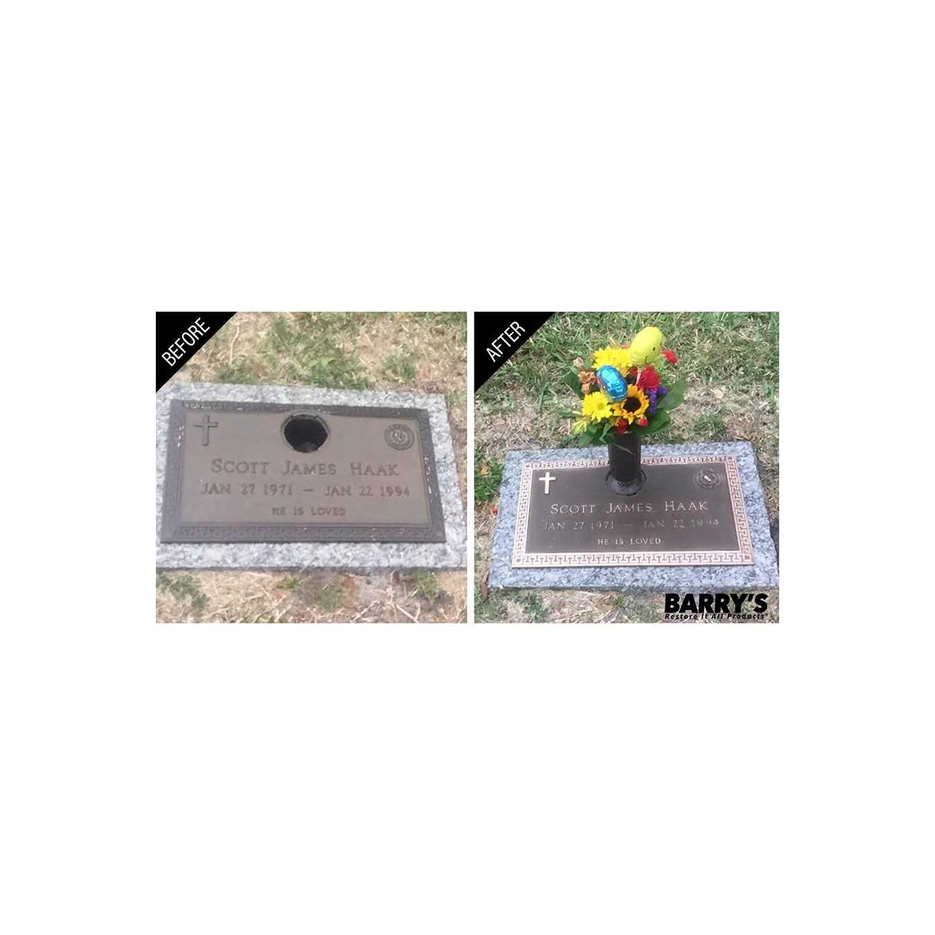 Barry’s Cemetery Marker Care System is the only product to be found effective to safely remove surface scale deposits while restoring a long-lasting richness to dry and discolored surfaces of granite and bronze. A complete marker care system; it works fast to clean and protect your granite and bronze grave markers to their original appearance and clarity. Give your loved ones the beautiful memorial they deserve! Application: This kit works best on DRY, dust and dirt-free surfaces. 1. Apply fine spray of Cleaner (green liquid) to surface (calcium deposits will foam white). Let stand 60 seconds. Use Brown Scrub Pad for granite surfaces and White Soft Scrub Pad for bronze surfaces to loosen buildup. Spray second coat where needed. This canister can be used as a water container. Sprinkle water onto surface as cleaner begins to tack or dry. Continue scrubbing. DO NOT scrub aggressively on bronze to avoid removing the patina. Wash cleaned surface with water and dry. 2. Shake contents of Renewer bottle (semi-clear liquid) before using. Apply liberal amount of Renewer to granite or bronze and rub on entire surface to be restored. Wait 2-3 minutes. Apply second coat and let dry. Polish with dry towel. If streaks appear, sprinkle with water, polish to a SHINE! Keep out of reach of children. Contains mineral spirits and citric acids.
