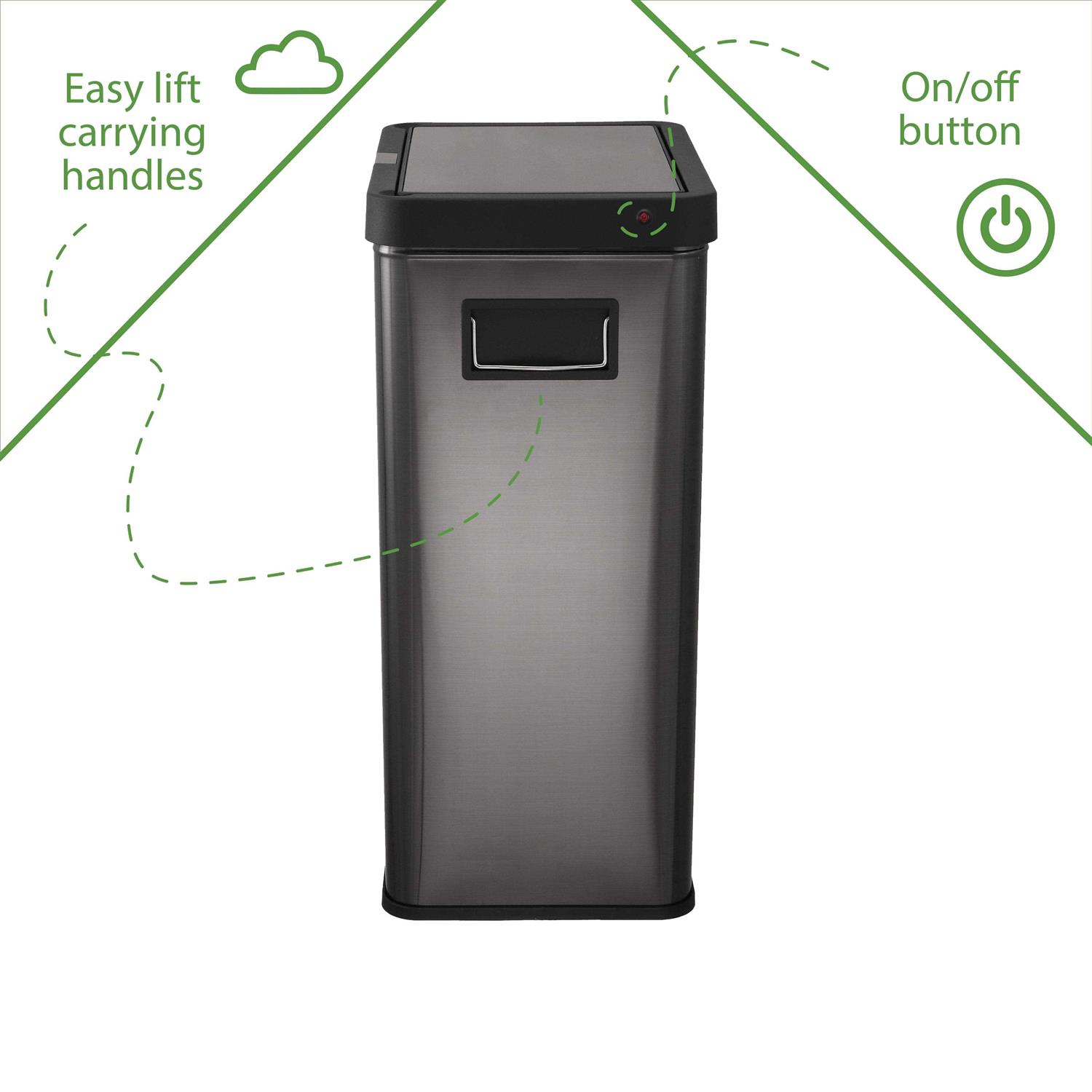 The Better Homes & Gardens hand motion-activated sensor Kitchen Garbage Can, in black, adds a touch of luxury and convenience to any home. This fingerprint- and rust-resistant durable stainless-steel bin features a spacious lid opening, allowing easy disposal of your waist. The convenient stay-open lid motion sensor technology employs dual sensors to pick up your presence in front of the bin and keeps the lid open until you walk away, thereby triggering the visual countdown timer to re-start before closing the lid. This technology helps prevent false lid openings. The hand-motion activated lid provides over 15,000 opening/closing cycles per new 4 “C” battery set (providing the included Use and Care instructions are followed). Batteries are not included.