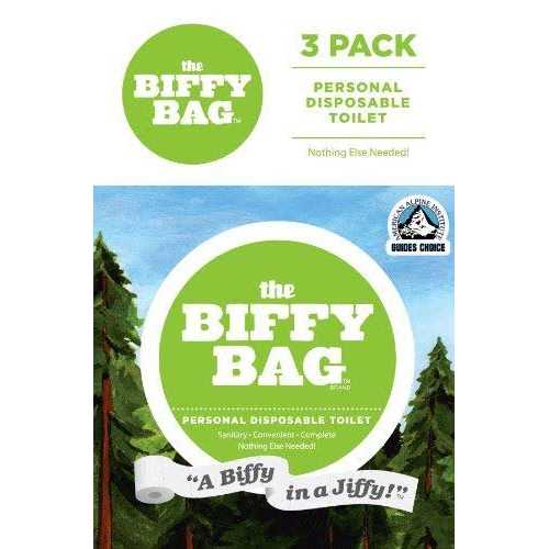 Where do you go when there’s nowhere to go? Biffy Bag to the rescue The award winning Biffy Bag is the world’s only pocket size disposable toilet designed to be used on its own in a sanitary and comfortable manner without needing a bucket or commode to sit on. You can use it with any dry toilet system but why lug all that stuff around if you do not have to? Its small compact size and unique comfort fit design makes it extremely portable. Weighing less than 1⁄2 of an I Phone makes it easy take everywhere you go. It is great for hiking, camping, hunting, travel, biking, boating, mountain climbing, trail rides, air planes, hot air balloons, outdoor concerts, job sites, Crohn’s, IBS, caving, burning man, kayaking, you get the idea it is nice to have whenever a clean toilet is needed. Ready to use in seconds, toss in trash when done. No Bucket No Odor, No Mess, It is truly a Biffy in a Jiffy.