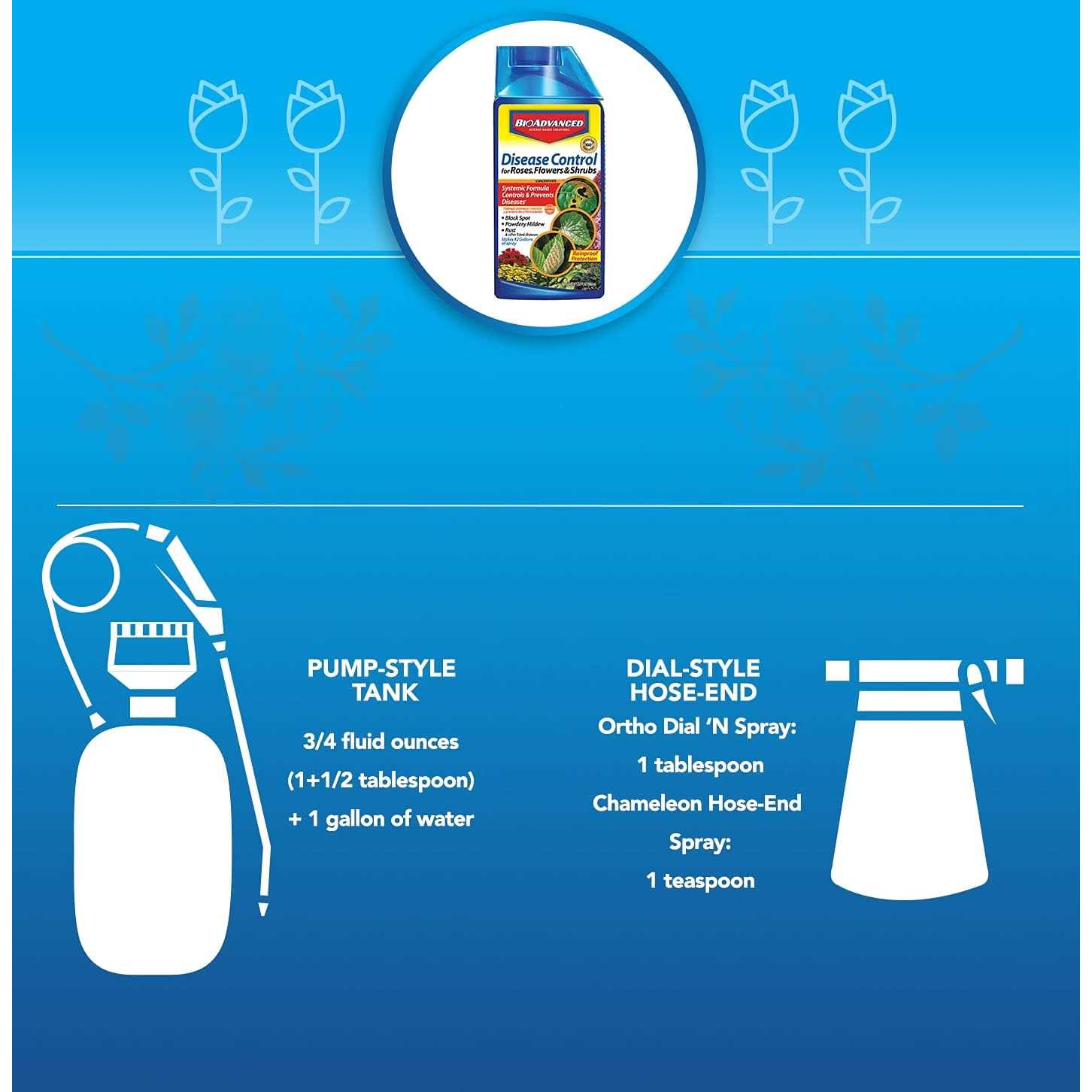 The systemic formula in BioAdvanced Disease Control for Roses, Flowers, and Shrubs cures and prevents listed common plant diseases that harm roses, flowers, trees, and shrubs. The fungicide controls and prevents black spot, powdery mildew, boxwood blight, and more. It can be used on roses, flowers, trees, shrubs, vines, and houseplants. Protecting from the inside out, BioAdvanced Disease Control offers rainproof protection and lasts up to 2 weeks. The concentrate is easy to use with a pump style tank. Now it is easier than ever to prevent listed disease and have beautiful plants. BioAdvanced Disease Control for Roses, Flowers, and Shrubs measures 32-ounces and makes up to 42 gallons of spray. Active Ingredients: 2.9% Tebuconazole. EPA Registration Number: 92564-5.
