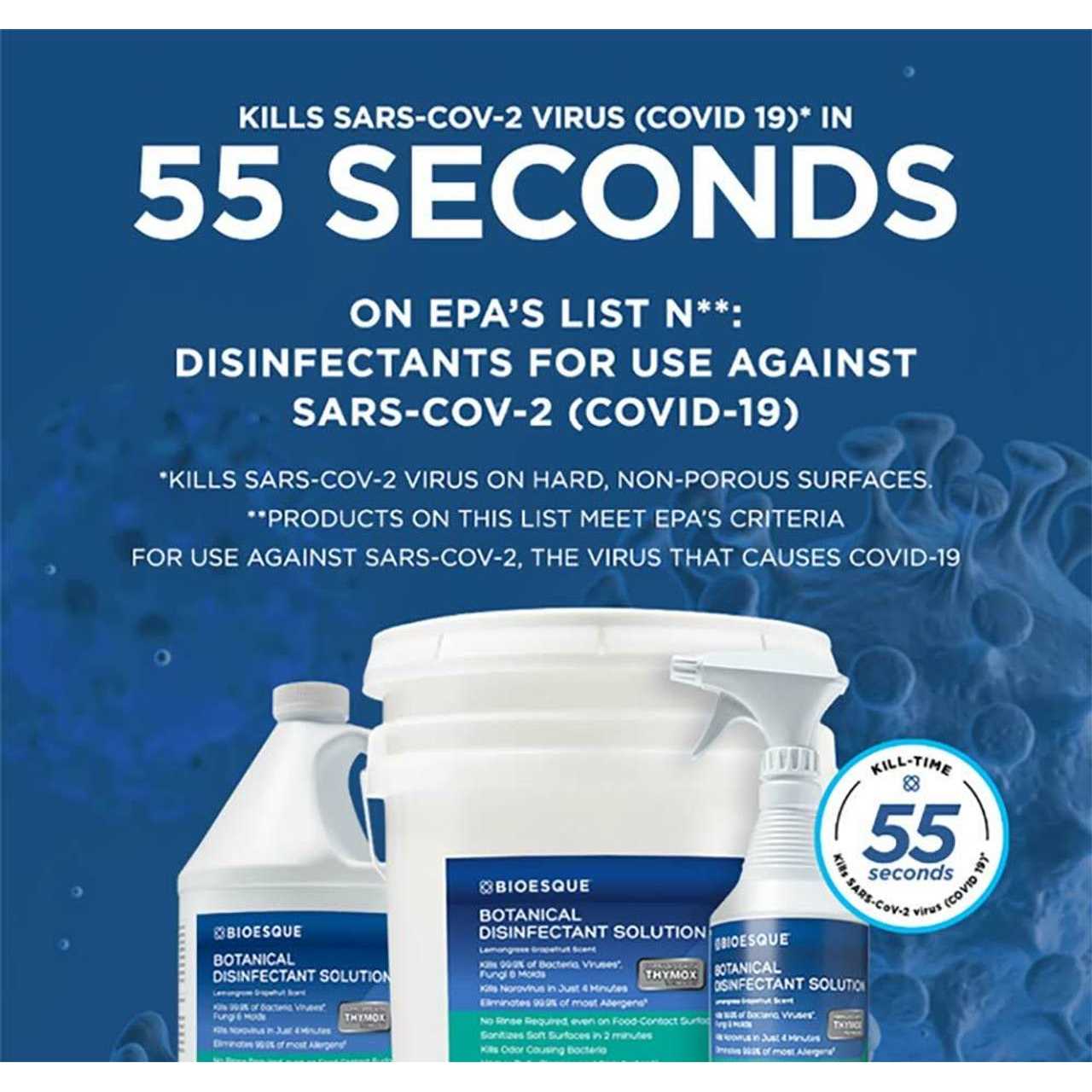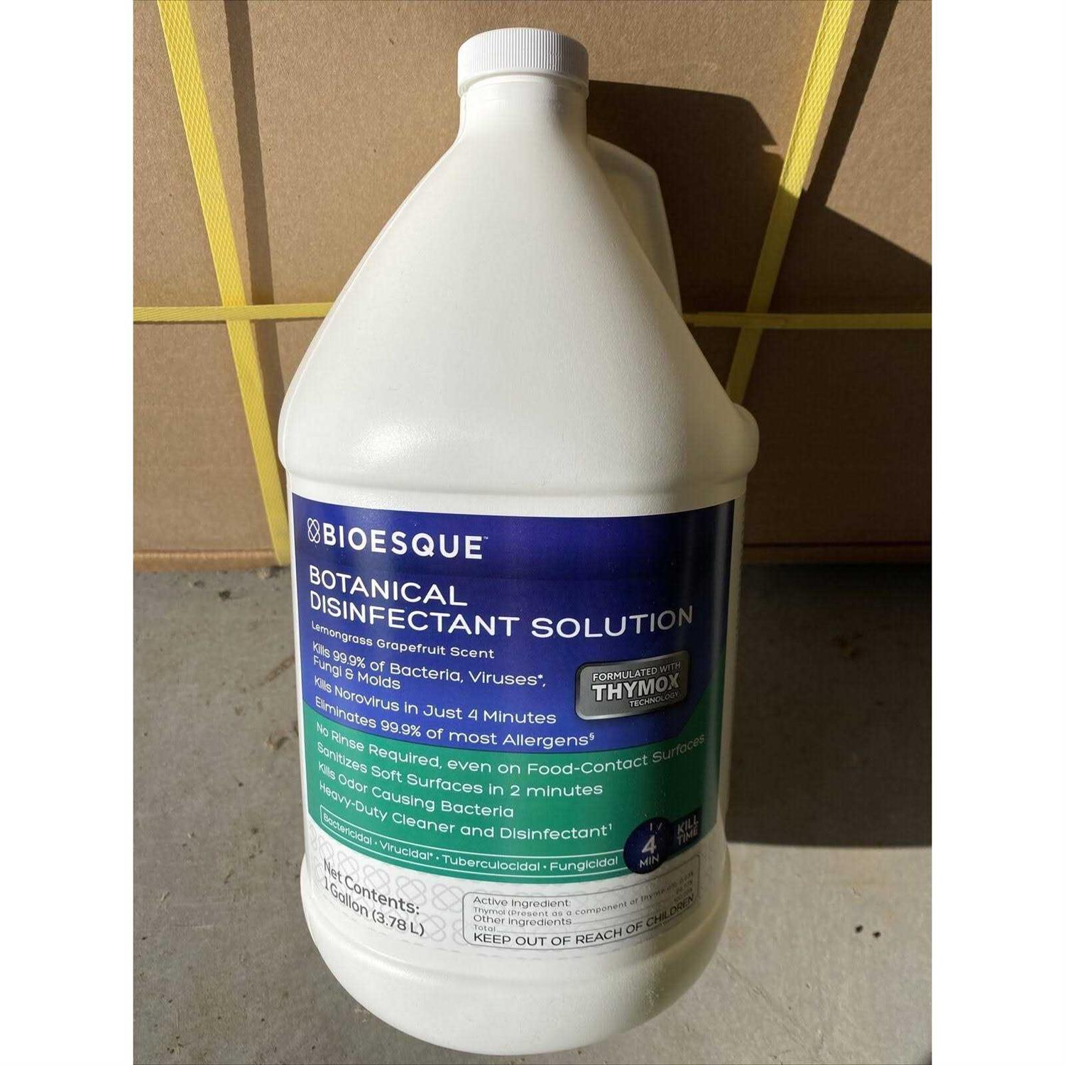 Cleans, sanitizes, disinfects and deodorizes in a single step, BIOESQUEs Botanical Disinfectant Solution is the natural solution for a wide range of cleaning challenges. With a formula that is free of bleach and other harsh chemicals, BIOESQUEs Botanical Disinfectant Solution is a great choice for hazard-conscious or environmentally sensitive settings. Powered by Thymox technology, it utilizes Thymol, a cutting-edge antimicrobial agent present as a component of Thyme Oil, to quickly power through grime and destroys the germs that it encounters. Kills Viruses in 1-minute, kills Bacteria in 2-minutes, kills Fungi and Molds in 3-minutes, kills Norovirus in just 4-minutes. Refer to product label for detailed pathogens.