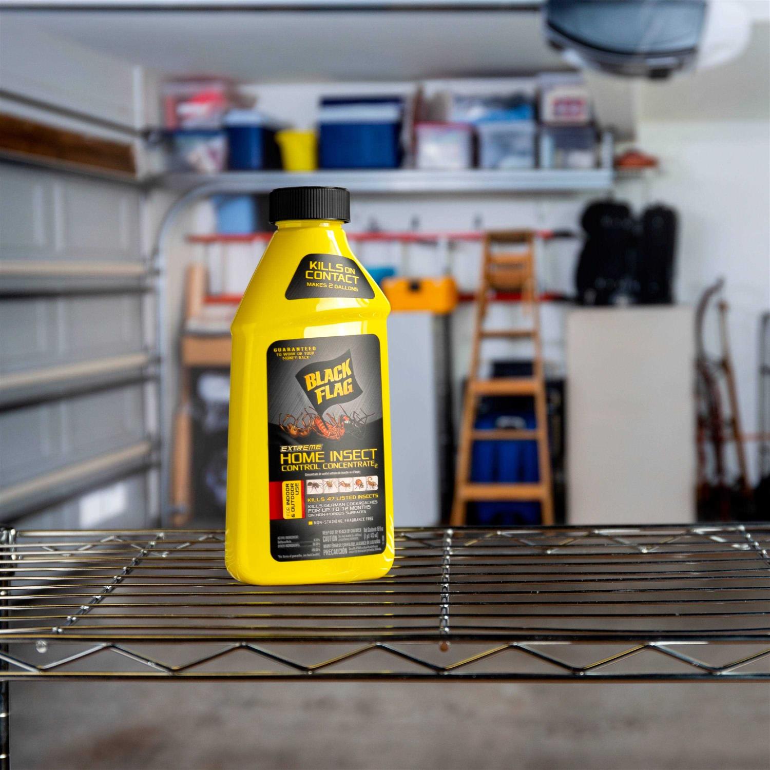 Insects invading your corner of the world? Whatever insect you’re fighting, Black Flag products are dedicated to providing the tools you need to regain control. With formulas that act fast and never back down, Black Flag insect controls have been arming homeowners in the battle against invading bugs for more years than any other brand. Black Flag extreme home insect control Concentrate makes 2 gallons of spray for use both indoors and outdoors to control listed insects on contact. Perfect for tank sprayers! Effective on 47 listed insect pests, including roaches, ants (including carpenter ants), spiders, centipedes, fleas, ticks, mosquitoes, flies, scorpions, moths, beetles and bed bugs. Kills German cockroaches for up to 9 months on non-porous surfaces. Perfect for use in kitchens, bathrooms, basements, attics and other household storage areas. Also works outdoors in areas where insects live and hide, including the perimeter of foundations, doors and windows, window screens and frames, and porches, patios, decks and garages. Apply around the perimeter of the home both indoors and outdoors. Spray around the foundation, doors, cracks, crevices, baseboards, around plumbing and other utility installations, exterior windows and all any other points where insects may enter. Use for spot treatment, holding 12 inches from the insect or surface to be sprayed. Spray until slightly moist but not to the point of runoff. Use as a refill for Black Flag extreme home insect control. Apply at the rate of one gallon of finished solution per 1,000 square feet as directed by label, following all precautions and directions.