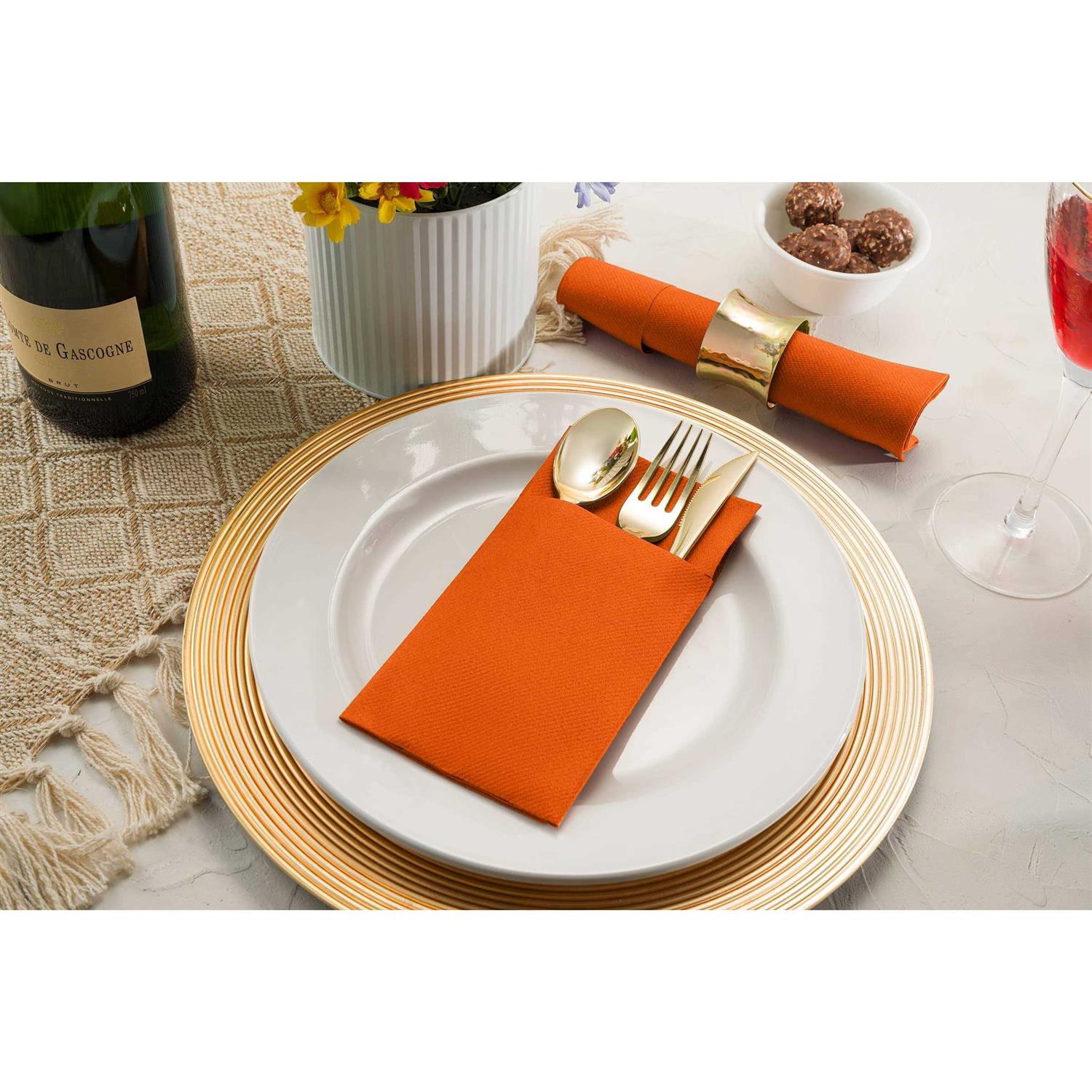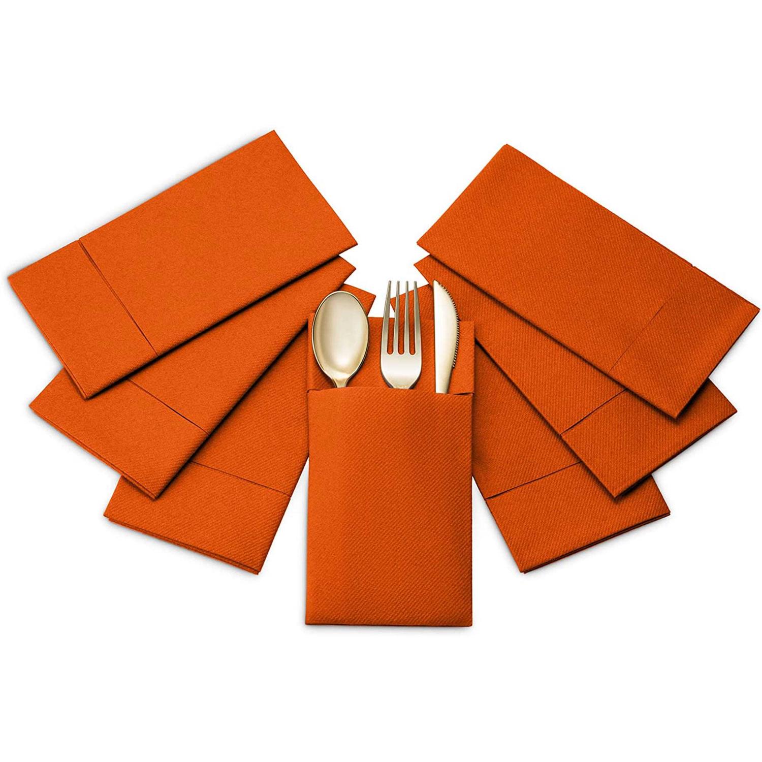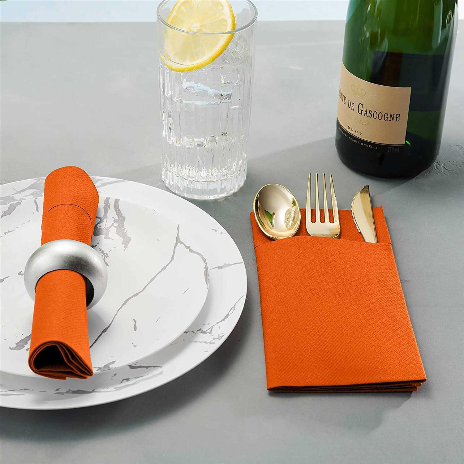BloominGoods 50-Pack of Disposable Linen-Feel Orange Napkins with Pocket for Silverware – 16″ x 16″