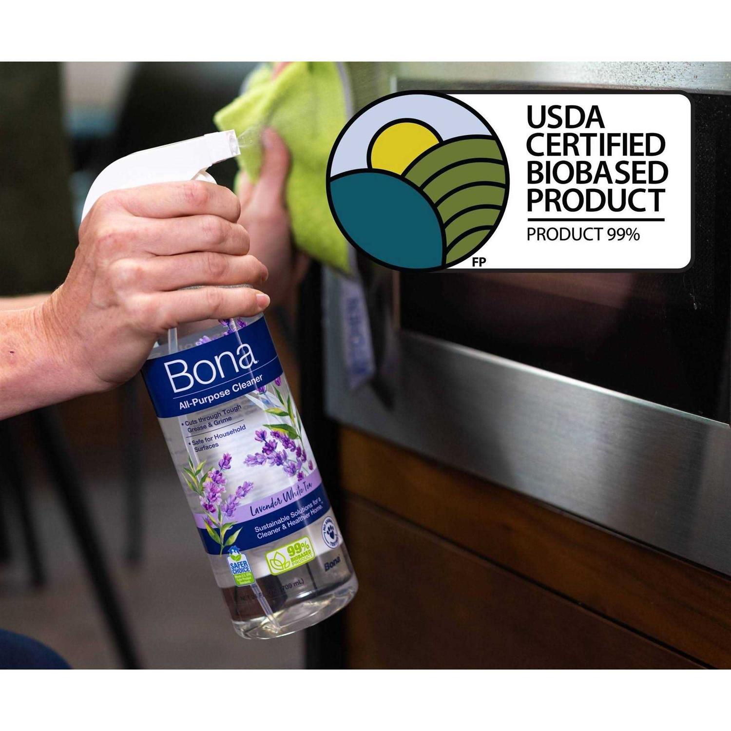 Relax. Bona makes it easy to care for your home. As the trusted leader in floor care, Bona is making hard surface care easy, too. Bona All-Purpose Cleaner effectively cleans tough grease and grime without damaging surfaces, making cleanup quick and easy around your home. Featuring a luxurious, yet delicate scent of Lavender and White Tea that’s infused with essential oils. Bona All-Purpose Cleaners are crafted with plant-derived ingredients. Always waterbased, biodegradable, and made of 99percent biobased content, which makes our solutions safer for you, your pets, and our planet. For best results, pair with Bona Microfiber Cleaning Cloths. Washable and reusable up to 300 times. Packaging contains recycled content – Bona spray bottles are comprised of 30percent post-consumer recycled content. Love your floors with Bona. Waterbased solutions and Safer Choice certification ensure a safer product for people, pets, and the planet.