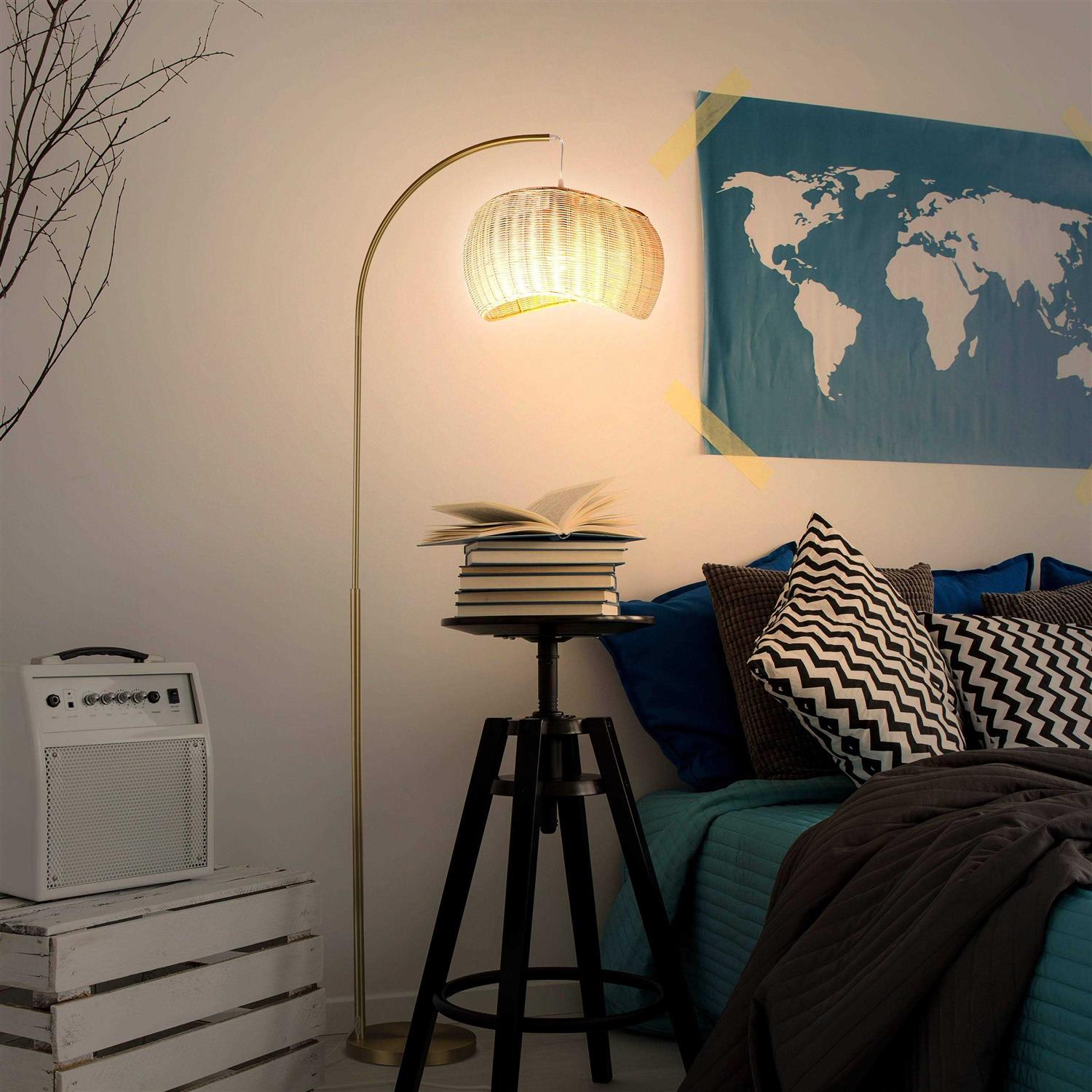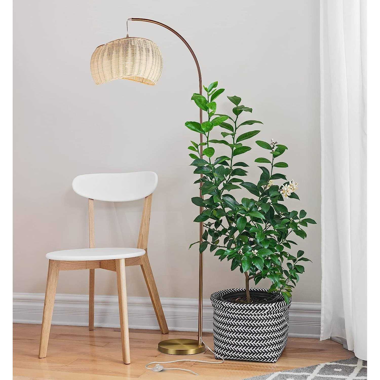 Introducing the minimalist Brightech Wave Pendant. The Wave Pendants features a gorgeous gold finish, clean design lines, and a wicker shade that works well with boho, contemporary, and other schemes. Its unique woven wave lampshade sits beautifully atop a shining brass pole and base. The shade is open at the top and bottom, providing uplight and downlight effects. This unique lamp stands 78 inches tall, and the lampshade hangs 15 inches from the arc for a total outward reach of approximately 24 inches. The calm, warm white light fills every room with high ceilings and does not overwhelm. Alexa and Google Home Assistant Compatible Light with Unique Hanging Wave Shade: Works with smart outlets that are Alexa, Google Home Assistant, or Apple HomeKit enabled to turn on/off. (Requires innovative outlet sold separately.) Fabric Metal. Care Clean surfaces with a soft duster or dry cloth.