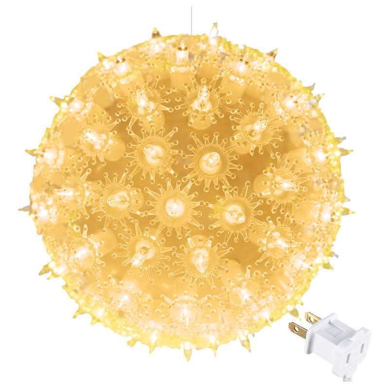 Starlight sphere – 6” size starlight ball lights dotted with 100 mini bulbs with rational spacing, clear lighting color, steady on, creating a realistic visual enjoyments, specially during operating at night. Come with gift box, an ideal and great gift for family, friends, relatives, colleague, co-worker, loved one or yourself Unpacking tips – Note: A strand of transparent slim lifting rope for hanging is placed among the mini bulbs of the light up Christmas ball lights, for easy taking it out, pull out some crystal ornaments around the mini bulb directly, then install them back again Note:The AC adapter should be protected from rain when hanging outdoor Easy replacement – 2 spare replacement bulbs and fuses for this lighted Christmas sphere included, take out the bulb crystal surrounding, then pull out the bulb from bulb fixture, plug in a new one with proper force. Slide out the fuse chamber cover toward two blades and take out the burnt-out one, install the new one correctly and close the cover. Plug in and try working Magic application – When there is Christmas ball lights, there is shiny mood. Wonderful outdoor Christmas sphere lights for house, festival and commercial decorations. Such as home, living room, bedroom, porch, yard, bistro, pub, cafe, hotel, mall, New Year, Halloween, birthday, theme party, wedding, evening party, ball party etc, creating an atmosphere of perfect wonderland Certified plug – UL certified plug with built-in fuses provides the steady current during for steady and long term operation br BRIGHTOWN 6 INCHES LIGHT BALL, PERFECT CHRISTMAS DISPLAYING AND AFFORDABLE! br br br Wish you happy and a pleasing mood in this coming Christmas holiday. Are you still boring about searching the appropriate and fascinating Christmas lights? br Don’t worry, the creative ball lights is just the right one for you! br br NOTES: br br 1. DO NOT install while plugged in. br 2. DO NOT secure cords with staples or nails. br 3. If changing to a new location, unplug before installation. br 4. Check the production condition before operation. br 5. This item is not a toy, keep away from children, kids, toddlers. br br SPECIFICATIONS: br br Bulb type: LED br LED bulb quantity: 100 pcs br Lead cord length: 30 inches br Working mode: steady on br Lighting color mode: warm white br Cable and plug color: white br Power cord type: 22 AWG br br Package Includes: br br 1 x 100 LED bulbs sphere lights br 2 x Replacement bulbs br 2 x Replacement fuses br For Fabulous Christmas Decorative Spherical Lights, Go Brightown Lighting System! SELECT and ORDER NOW!