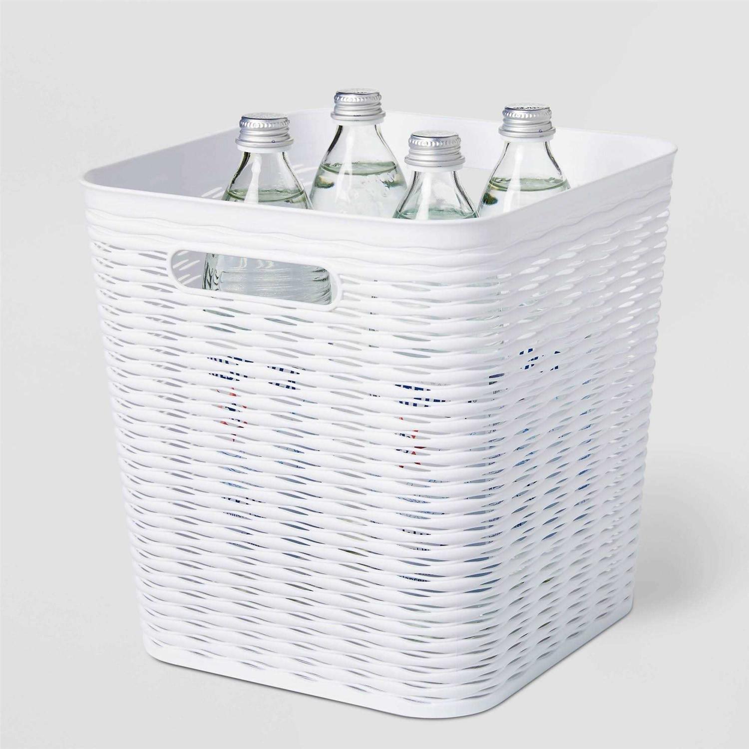Keep your space looking neat and orderly with this 16Liter Wave Design Cube Basket from Room Essentials. Made from durable material for longlasting use, this storage bin showcases a wave design to create a stylish look, while cutout handles make it easy to carry from one place to another. Great for storing clothes, magazines, toys and more, this storage solution will help keep your home clutter free. Whether you need a spot to stash spare blankets or organize everyday items, this decorative basket helps you bring order to any space in your home. – Features Square shape – Dimensions Overall 10.9 inches H x 10.7 inches W x 10.7 inches DCapacity Volume 16 liter – Assembly Details No assembly required – Product color name True white – Material Polypropylene