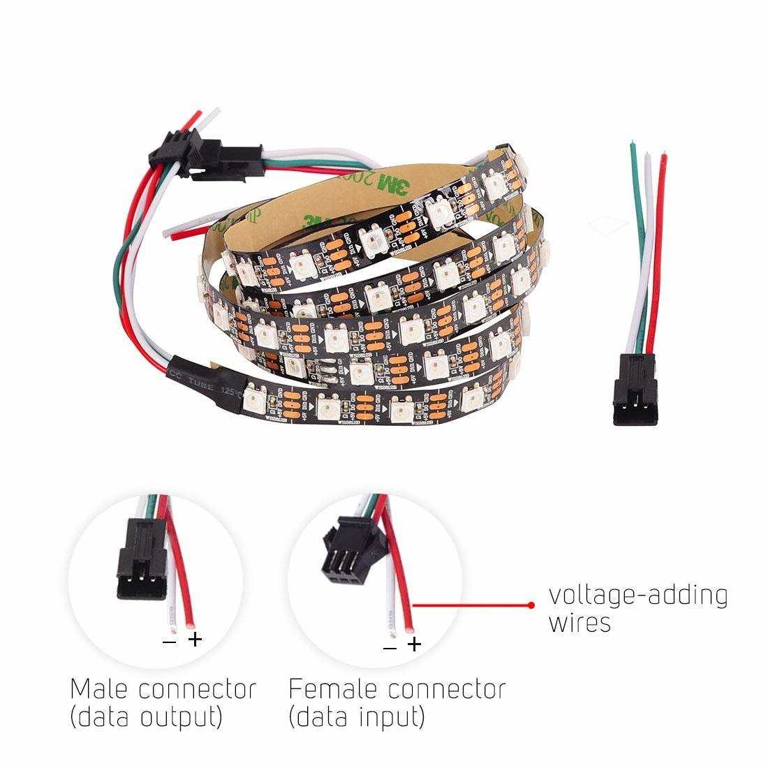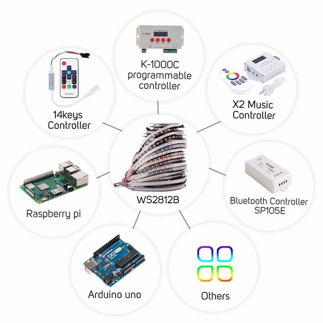 Individually Addressable. – Dream full color Programmable LED Strip,WS2812B led, WS2811 IC Built in 5050SMD.256 brightness display and 24-bit color display. – FPCB, JST-SM connectors on both ends for easy installation – Works great with Arduino and is easy to program. The addressable IC is built-in the 5050SMD.Each pixel can have its own color and brightness as your wish. Can be cut each 5050SMD individually, and will works great without damage – DC 5v. Match use controller can appear colorful curtain-up/ flow water/raindrop/jump flash and so on hundreds of lighting effect, you can also edit animation effect by Coreldraw/Flash/Led – Edit software. – Making led screen, led wall, advertising board, apply to hotel, KTV, bars, Outdoor advertising signs, Festivel Christmas or wedding party decoration,It has adhesive glue on the back, so you can stick it to the wall or other items conveniently as you like.