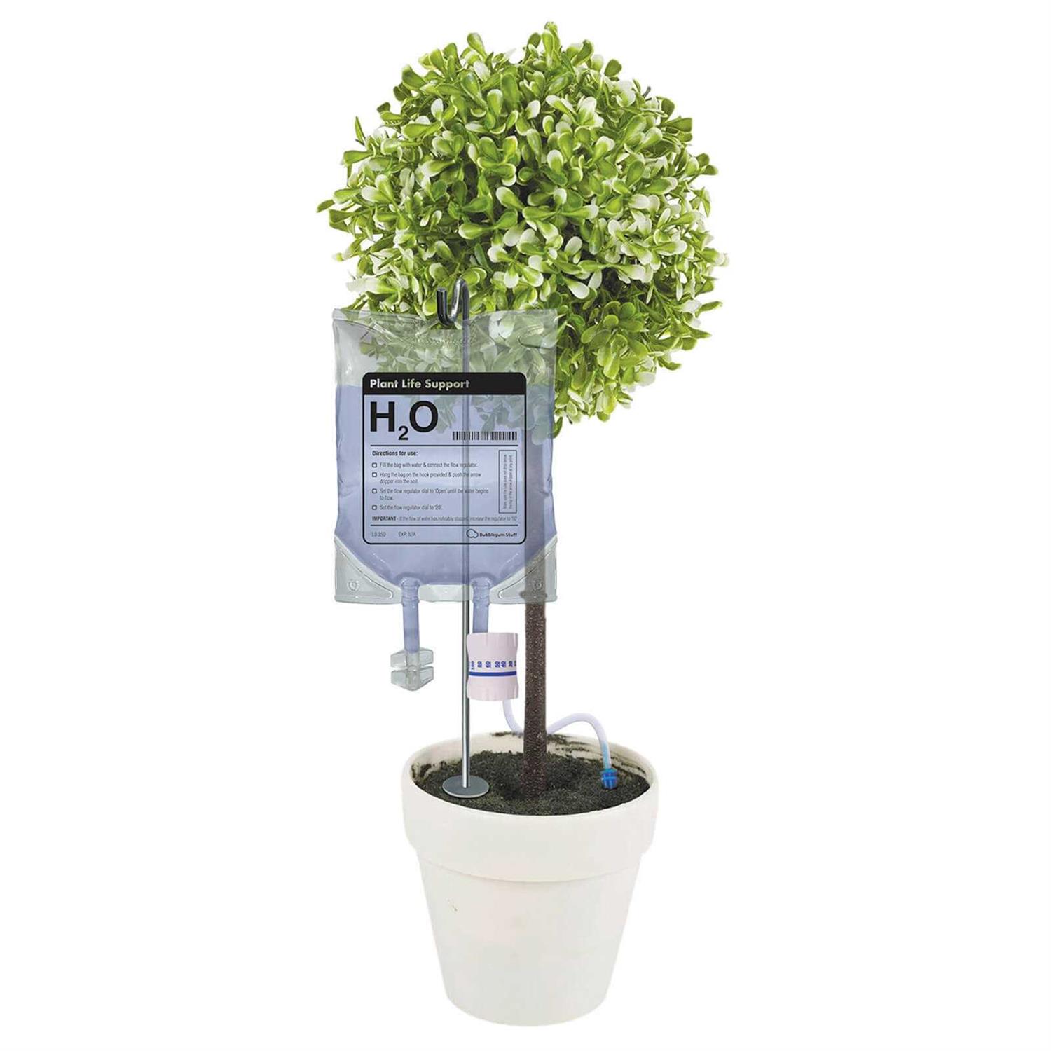 Feed me, Seymour! Don’t leaf your plants in the murderous hands of a friend or a relative while you are away on that dream trip! Our IV Plant Life Support system will drip feed everything your plant needs for the duration of your vacation. Peace of mind – it’s the ‘root’ of all happiness.Designed to look like a miniature medical IV drip bag, it is suitable for small house plants, and will keep your plant automatically watered for up to 7 days! Easy to assemble! Includes “Directions for Use” directly on the H20 bag:Fill the bag with water & connect the flow regulator.Hang the bag on the hook provided and push the arrow dripper into the soil. Set the flow regulator dial to “Open” until the water begins to flow.Set the flow regulator dial to ’20’. IMPORTANT If the flow of water has noticeably stopped, increase the regulator to ’50’. It’s a hilarious gift for the registered plant murder in your group, as well as for nurses, doctors, and other essential medical workers! Each Plant Life Support contains x1 350ml IV bag, x1 metal peg, x1 valve, x1 dripper. Packaging made from 100% recycled paper. Simple assembly. Our IV Plant Life Support Drip is your plants life line.