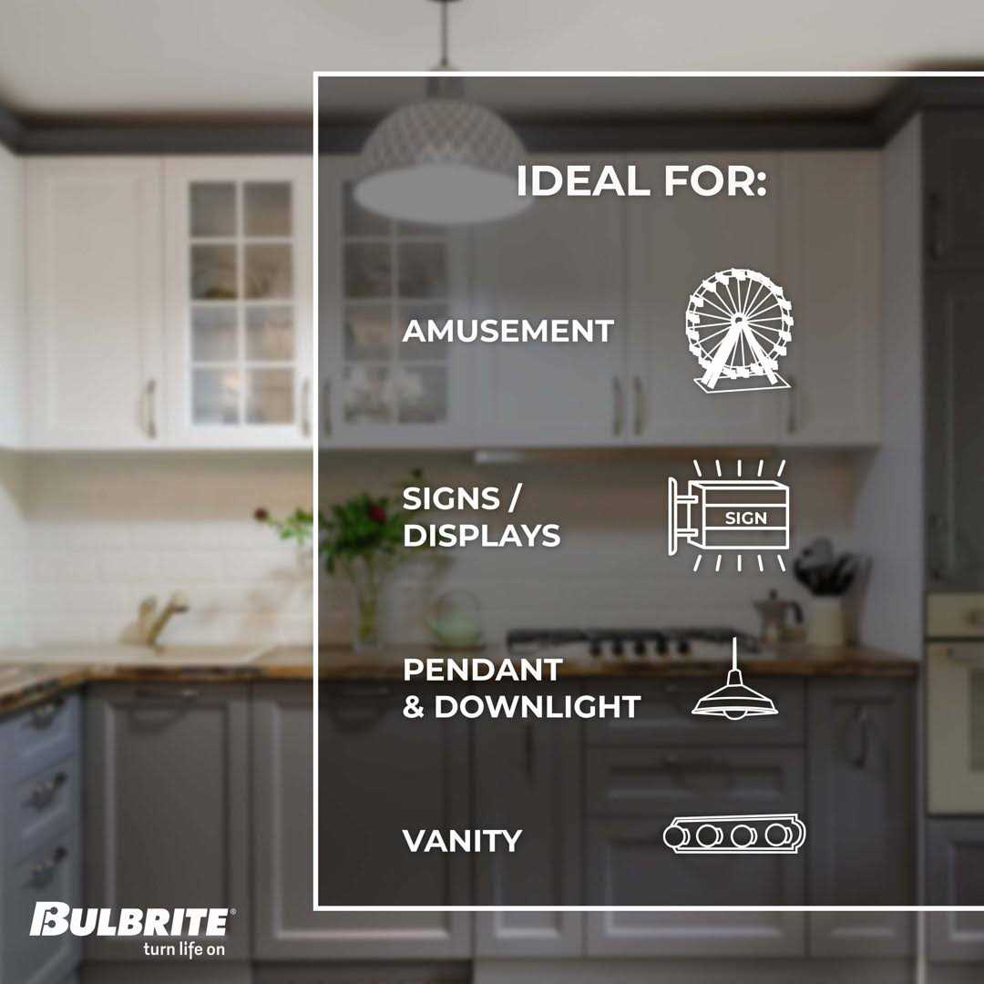 Bulbrite’s line of Incandescent globes are the perfect option for any household fixture, such as bathroom vanity’s or open chandeliers. Ideal for use in vanities and home decor lighting. Fully dimmable Incandescent globe.