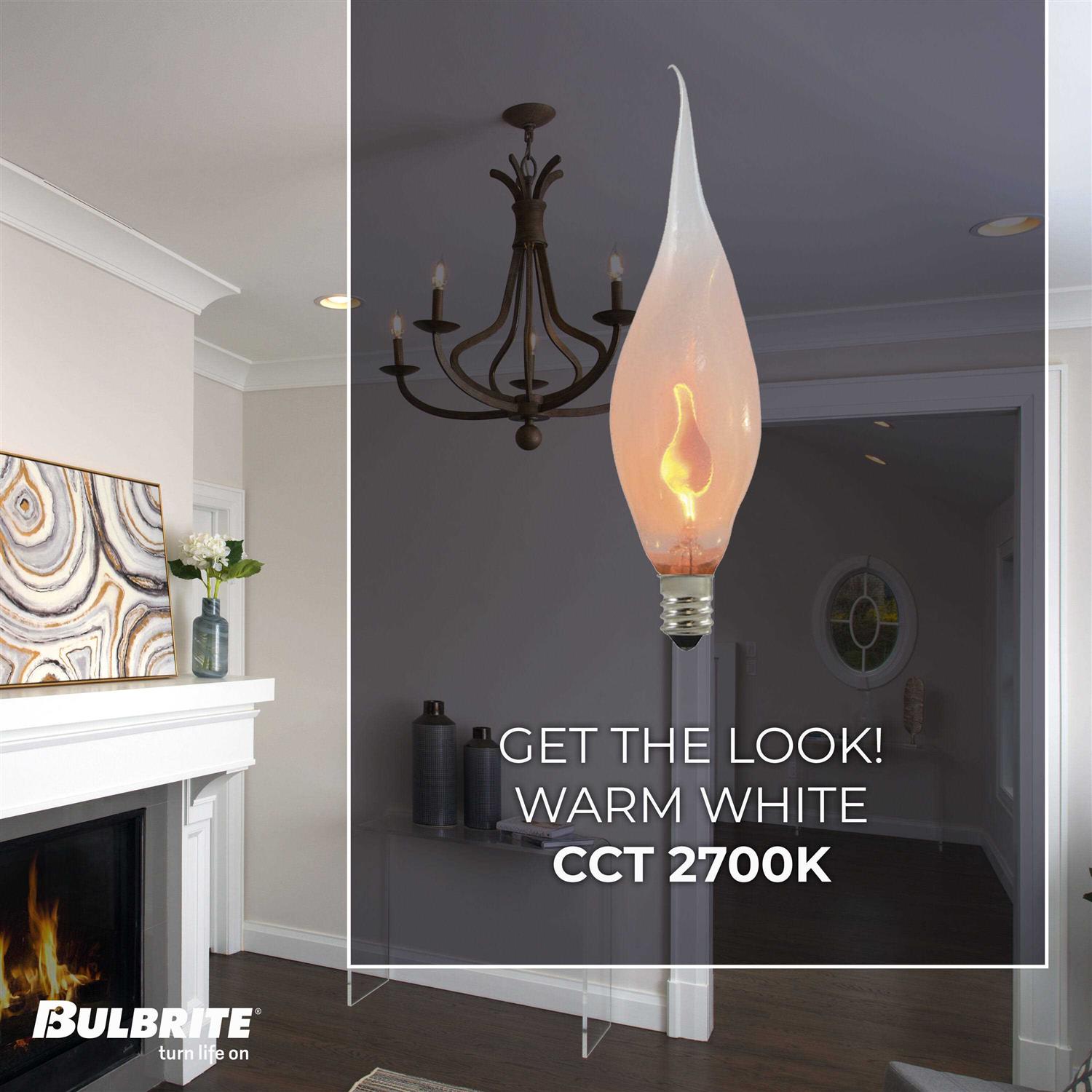 Included in the box are 12 individual incandescent bulbs. Each unique bulb is 10 watts and rated at 2700K for warm white light. These bulbs are fully dimmable. Their unique silicone & flicker features make for a flame shaped bulb that will compliment any fixture. Dimensions are 4.5 x 0.63 x 0.63 inches. This is called a flicker lamp, meaning it can imitate the flicker of a real flame without the hazard of open fires and the effects of burning candles within your home. Considered a safe and realistic alternative to traditional candles.