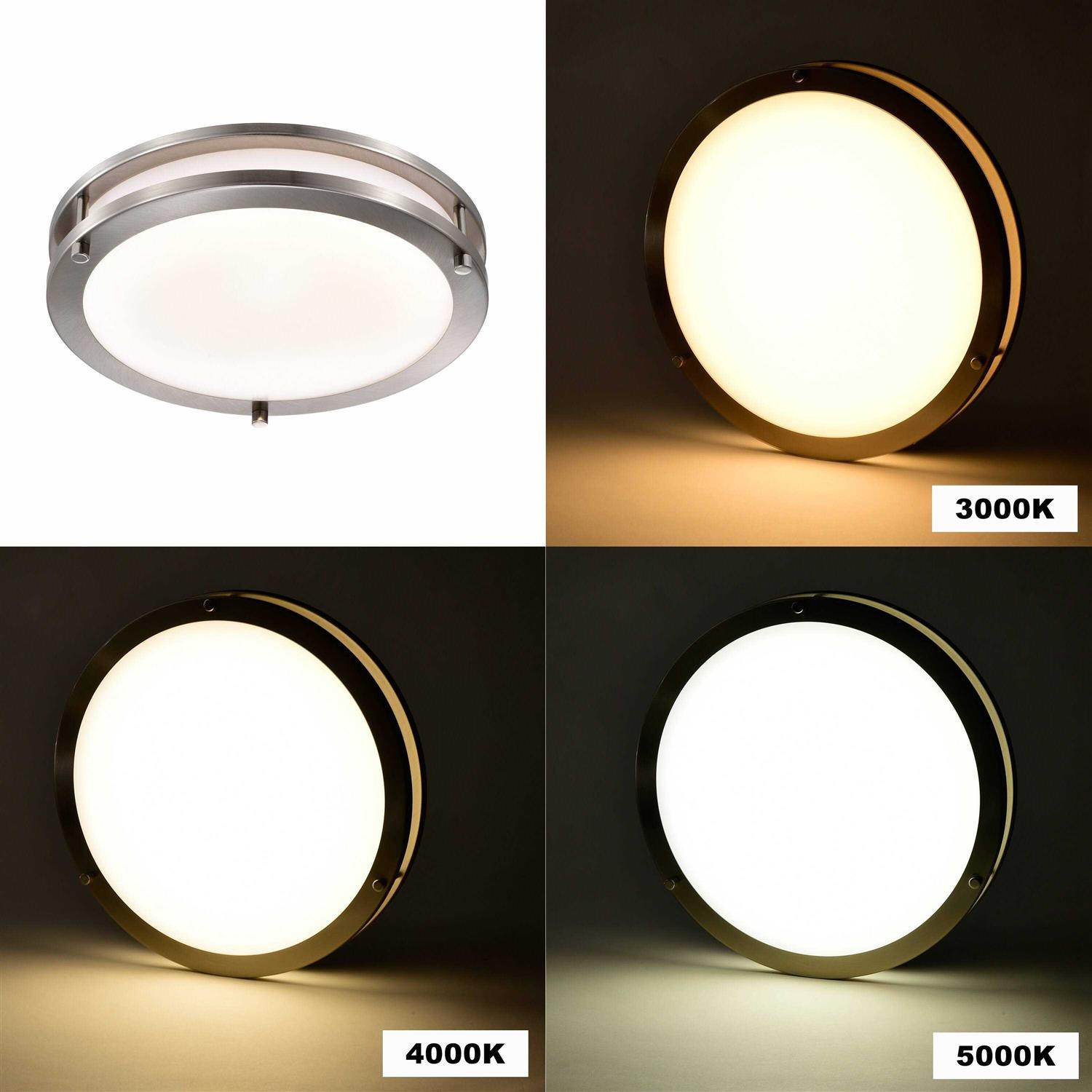 The LED flush mount features a stylish design with a decorative brushed nickel double band frame and adds a clean-line touch of elegance to any room’s decor. The white acrylic diffuser of the flush mount light provides soft and eye-care ambient lighting to the room. You choose from 3 color temperatures 3000K/4000K/5000K using an integrated switch directly on the fixture. The light also can be adjusted brightness with a dimmer switch. It provides general illumination and is ideal for bedrooms, hotels, hallways and many other settings.
