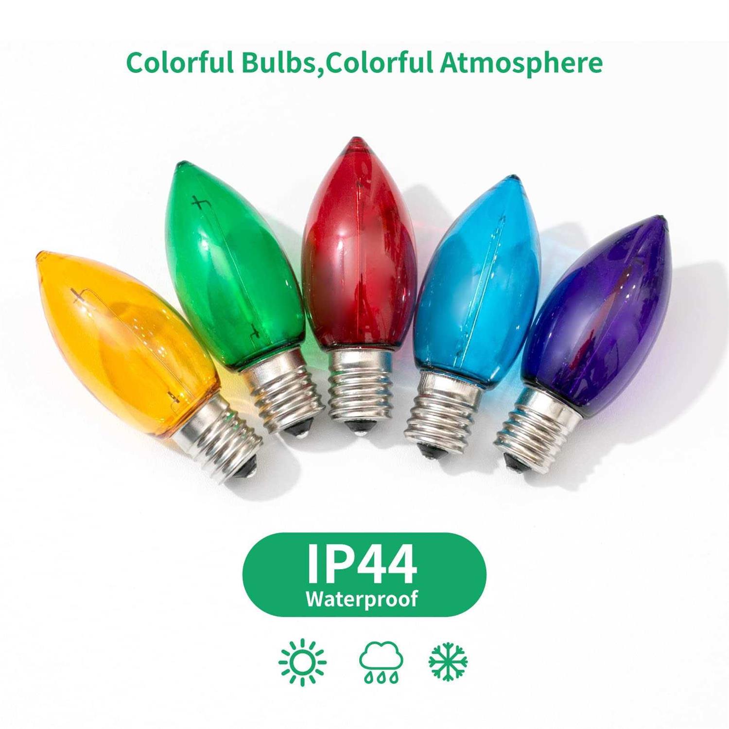 About The Item: Multicolor Bulbs: Our Multicolor C9 Led Bulbs Are 25pcs 0.6 Watt Bulbs With 5 Colors: Red/purple/green/blue/orange,not Only These Bulbs Are Colorful Plastic Cover But Also Colored Led Filaments, It’s A Good Idea To Save Your Time And Money To Buy Single Color,each Color With 5 Pieces Bulbs In 1 Box. Decorative Replacement Bulb: The Colored Bulbs Are Mostly Decorated For Holiday, Events, Parties And Festivals, Such As The Upcoming Christmas Halloween Wedding Thanksgiving And Birt.