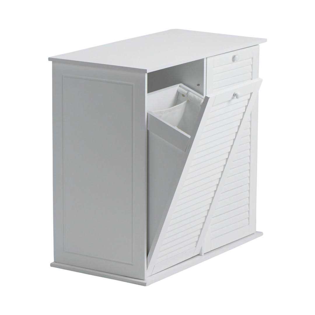 Beachcrest Home Make laundry day loads easier with this handy hamper. Crafted from manufactured wood, this piece features tilt-out front doors that let you access two compartments, so you can sort light and coloured clothes as your week goes on. Machine-washable white liners are included to make the process even easier. Beyond functional, this clean-lined design showcases a neutral white finish and louvred accents for an airy and coastal look. Assembly is required.