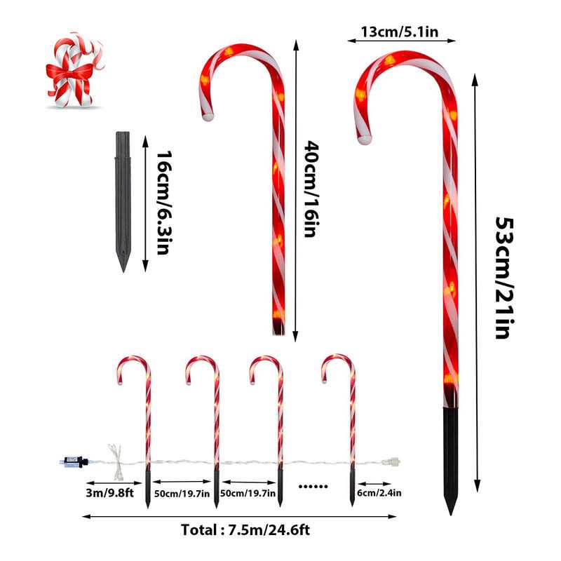 Candy Cane Outdoor Landscape Lights 10 pcs Candy Cane 21in Landscape Lights with 8 modes end to end plug in Memory Function String Lights Memory Function The controller is designed to remember the last setting after cutting off the power. 8 modes for choosing combination, in waves, sequential, slogs , chasing/flash, slow fade, twinkle/flash, and steady on. End To End Expandable String Lights Female plug at the end is connectable for more than one string, which makes you can connect max 6 sets together. Perfect for Christmas, weddings, Valentine’s day, parties, pubs, concerts and other celebration occasions Specifications: Item: Candy cane lights LED Quantity: 60 LEDs, 1 candy cane of 6 LEDs Length: 7.5m/24.6ft Wire Color: Transparent 8 Flashing changed modes Memory Function Max 6 Sets Expandable: Max length 45m/147.6ft IP44 Waterproof Voltage: Plug in 29V What you can get? There are ten candy canes within the set, and each one is connected by a wire and has LED lights on the inside, Each of candy cane lights has 6 LED light beads (Others use tungsten lamps) to provide lots of illumination. The life of LED lamp beads reaches 30,000 hours. You can enjoy the candy canes all day and night. IP44 Waterproof design can be resisted rainy and snowy, Pathway Christmas lights is built with weatherproof technology, with 10 high quality plastic stakes together use can ensure the candy cane Christmas lights could stand under any weather. Red and white candy cane light presents an attractive Xmas atmosphere. Transform your home into a festive, holiday-ready winter wonderland in no time! This candy cane pathway lights perfect for spicing-up your decor or setting the mood for festival like Christmas, Thanks Giving Day, Halloween Parties and other festival.