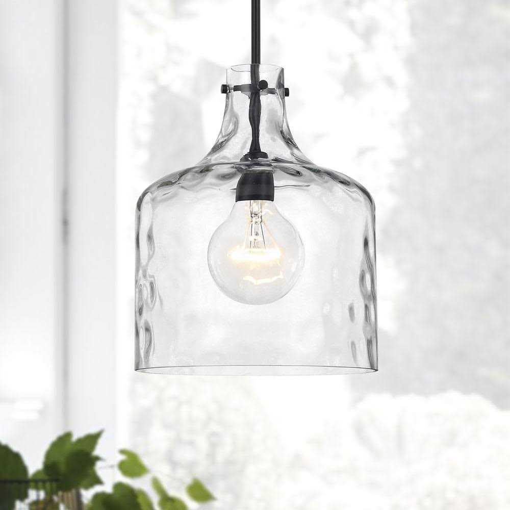 Capital Lighting Homeplace Pendants Collection Pendant fixture has power rating of 100-Watts and voltage rating of 120-Volts. Clear water glass shade ensures even light distribution. The contemporary fixture with E26 medium base socket can accommodate 1 100-Watt incandescent lamp. It features a base backplate of 5-Inch x 0.75-Inch. It includes 2 6-Inch and 12-Inch removable rod. The fixture is 11.75-Inch wide and has minimum hanging height of 20.75-inches. It is suitable for kitchen dining room living room and bedroom. The pendant fixture is UL listed.