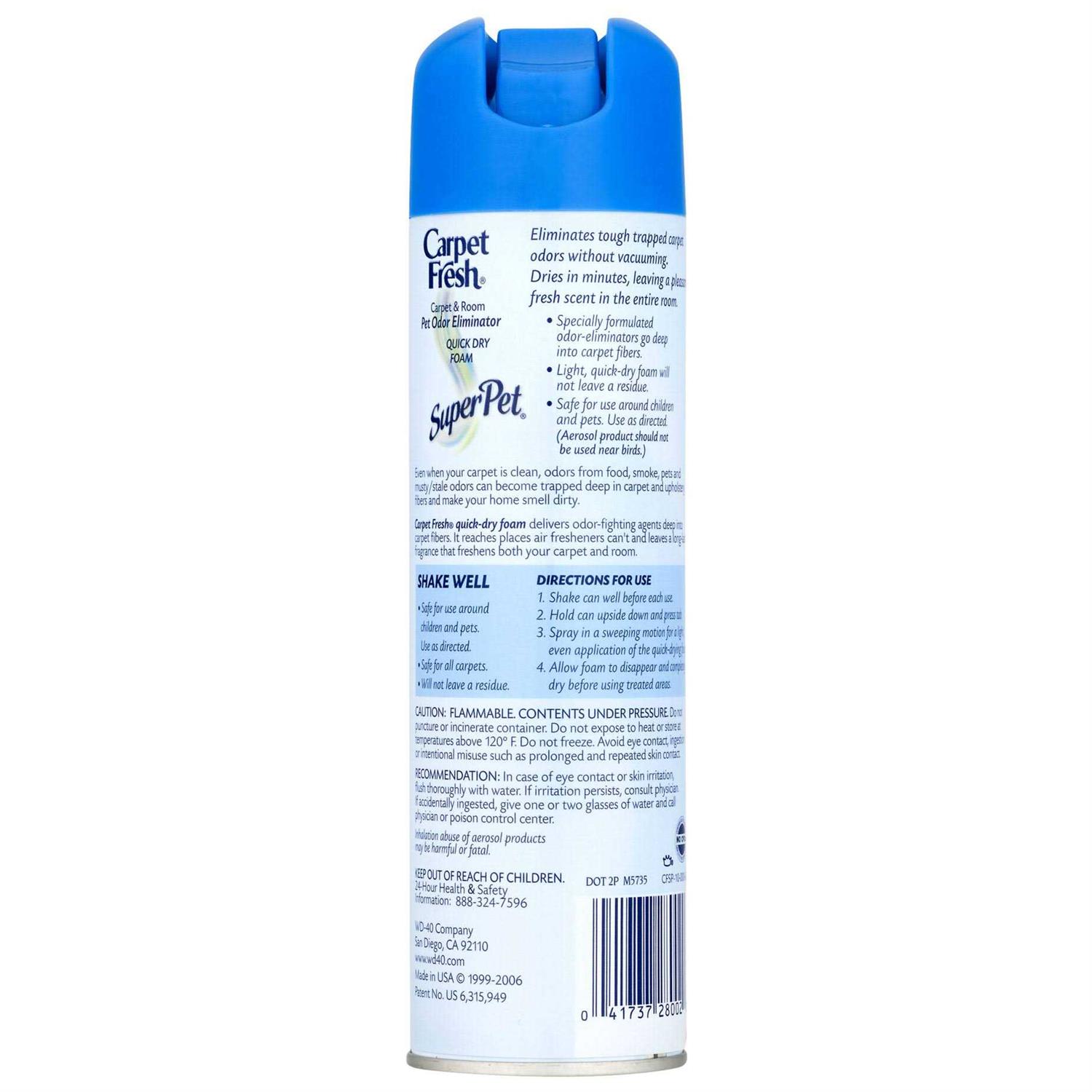 Live With Pets, Not Their Odor, You love your pet. You dont love the odors they can bring into the house and trap in your carpet. Give yourself a treat and use Carpet Fresh Quick-Dry Foam Super Pet or Carpet Fresh Powder Neutral Air for Pets to eliminate those odors and leave your carpet smelling fresh. Quick Dry Foam Eliminates tough trapped carpet odors without vacuuming. Dries in minutes, leaving a pleasant, fresh scent in the entire room. Carpet Fresh Quick-Dry Foam delivers odor-fighting agents deep into carpet fibers. It reaches places air fresheners cant and leaves a long-lasting fragrance that freshens both your carpet and room.