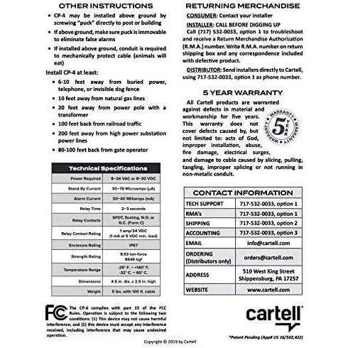 Direct replacement for CP-3 with added features. CP-4 automatic gate opener is Cartell’s best automatic gate opener ever. The Free Exit System opens your automatic gate so you and your visitors can exit the property without having to use a remote or keypad. This self-contained system connects directly to any gate opener system without an external output board and can be used with solar-powered gates. Features: Self-contained system, Conduit-ready housing, Sensitivity adjustment, Better heat resistance, More lightning protection, New proven digital circuit Weather-resistant cable One model, less confusion Industry-standard wire colors Universal voltage AC & DC Works with all gate operators