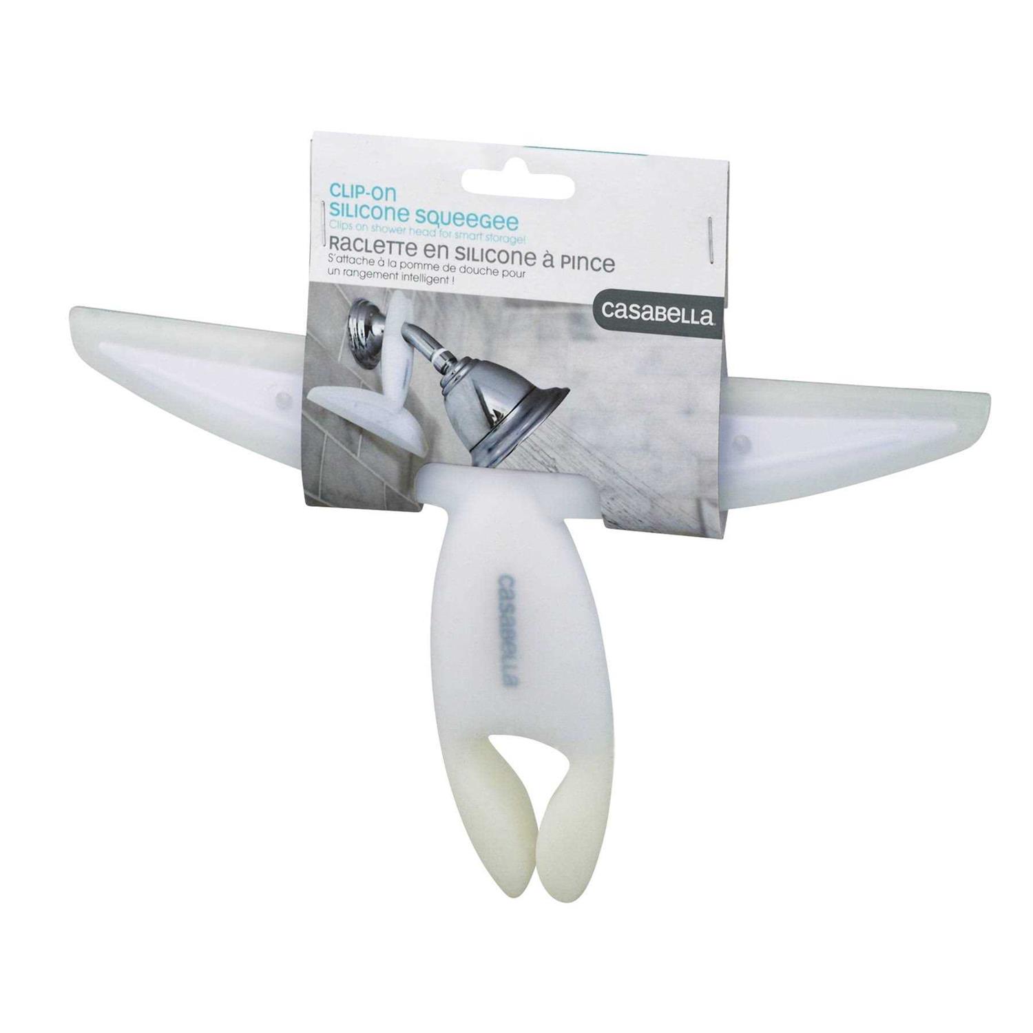 Casabella 44037 Clip on Silicone Squeegee, 10″ Wide, White Streak-free cleaning Comfort grip Clips on to shower neck Hangs on Shower Head Comfortable Soft Grip Soft Silicone Skin Great for Cleaning Glass Shower Doors and Tile Surfaces 10-inch wide Fulfilled by A.V.I. Mfg Corp