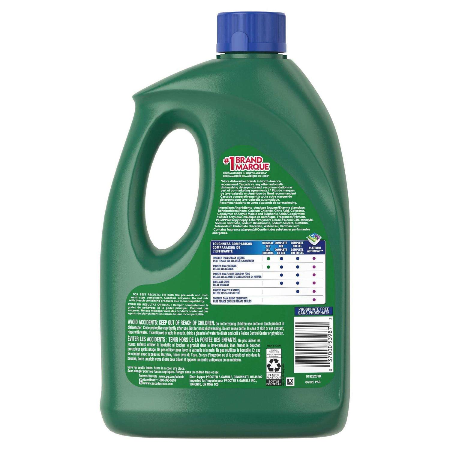 Cascade Complete Gel dishwasher detergent powers away even 24-hour stuck-on messes for a complete clean. That’s because Cascade Complete Gel dishwasher detergent has 2X the Cleaning Power* (*on starch & protein soils vs. Cascade Original Gel dishwasher detergent), and it’s formulated with the grease-fighting power of Dawn dishwashing liquid. Cascade Complete Gel dishwasher detergent is phosphate free. For best results, use Cascade Complete Gel dishwasher detergent with Cascade Power Dry Rinse Aid for powerful drying and Cascade Dishwasher Cleaner to keep your dishwasher machine sparkling. Save up to 15 gallons of water per dishwasher load when you skip the pre-wash and run your dishwasher with Cascade Complete Gel dishwasher detergent. Cascade Complete Gel dishwasher detergent is also available in easy-to-use ActionPacs.