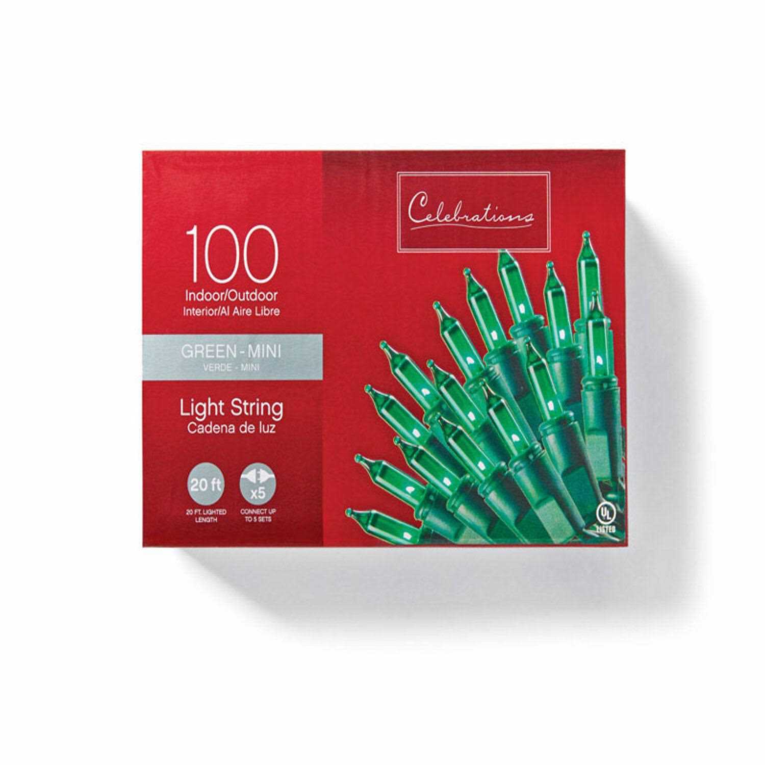 These Classic Christmas mini-lights from Celebrations are perfect for both outdoor and indoor decoration. Each strand contains 100 green mini-lights and features a lighted length of 20 feet. Connect up to 5 sets at once! The Celebrations brand brings you the classic incandescent lighting solutions youve grown to love for years with timeless looks that help you reminisce about the Christmas past. Celebrate the holiday season by lighting up your home with lights that are perfect for inside and outside the home.