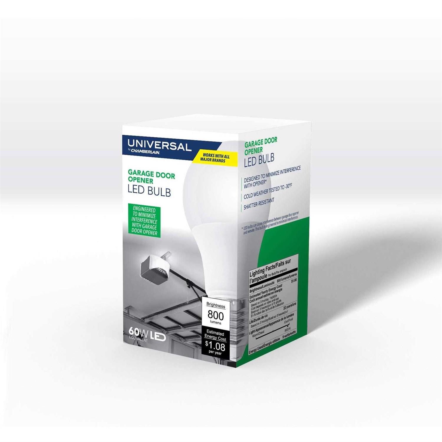 The garage door opener LED bulb is engineered specifically for your garage door opener and works with all major brands, providing 800 lumens of brightnessa 60w equivalentusing 9w of power. While normal LED bulbs can cause interference between a garage door opener and remote, this bulb is designed specifically to minimize interference. The bulb is shatter-resistant and cold weather tested for harsh climates -30 degree F/-34 degree C. The bulb has a long life at 25,000 hours (or roughly 22 years) and an estimated energy cost of only 1.08 per year.