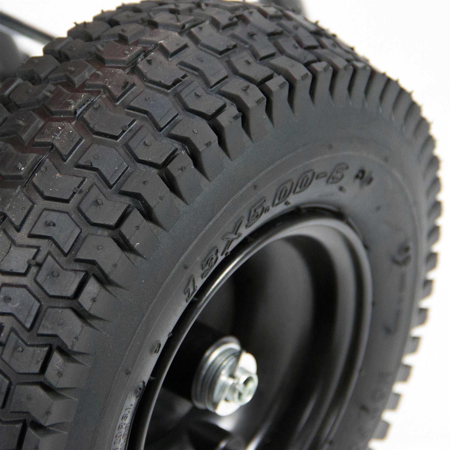 - Strong pneumatic tires handle all terrains