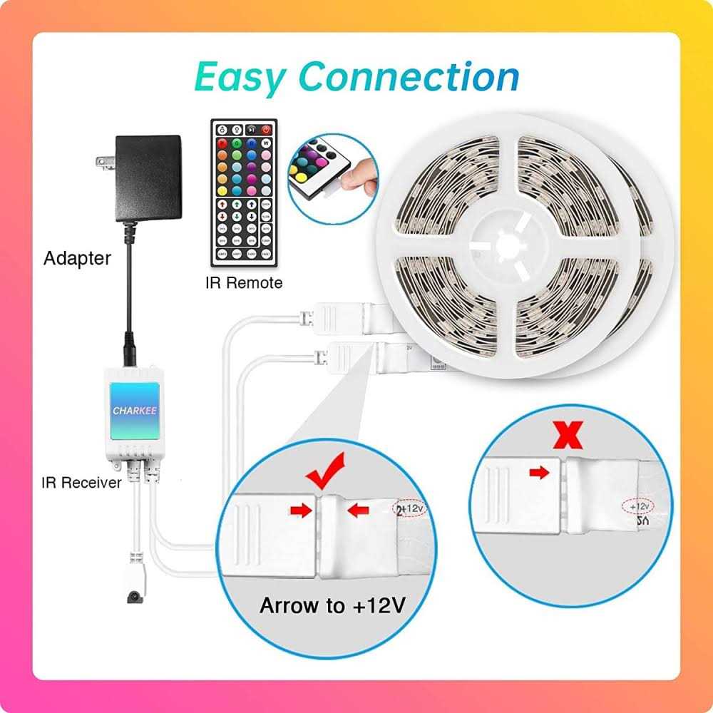 Cuttable design allows you to adjust the length of RGB led lights strip however you like (The rest cant be used). Perfect for bedroom, living room, cabinet, party, kitchen, dorm room, screens, beds, shelves, picture frames, back of TVs, desk, stairs, home parties for accent effects, illumination and entertainment. Durable Remote Multicolor ControlledAll colors at your fingertips. The IR remote controller is equipped with Receiver, enabling you to power on the LED strip lights from your bed cosily. With the control box, you can adjust brightness, power the RGB LED strip lights on/off, multicolored options and adjustable brightness. The strip LED lights with 20 preset colors/6 modes lighting effects/6 DIY modes, you can transform your space with vivid colors. Dry, smooth and clean surface suits the back-adhesive of led light strip. The led strip lights are easy to install, just tear and paste them on your bedroom walls. App download: you just need to scan the QR code and connect according to the instructions. Then enjoy it! Commitment: Our service organization provides service and maintenance for complete User Experience, from installation to usage.