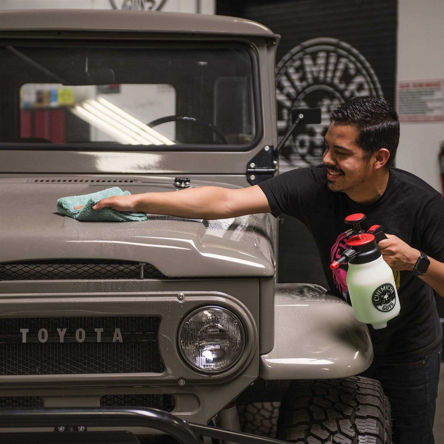 Are you still endlessly squeezing that spray bottle and suffering from tired and cramped fingers? Meet the 50Ounce Mr. Sprayer, the new way to effortlessly apply your favorite Chemical Guys detailing liquids! Simply prime the pump, adjust the nozzle from fine mist to jet stream and get spraying for your quickest and easiest detail ever. Simply use the pre-labeled measuring marks on the side of the heavy-duty 50 Ounce UV-resistant bottle to dilute your favorite Chemical Guys detailing liquid. The locking trigger allows you to shoot an endless supply of waterless wash, detail spray, glass cleaner, after wash, and more for a detailing experience like you’ve never had before!