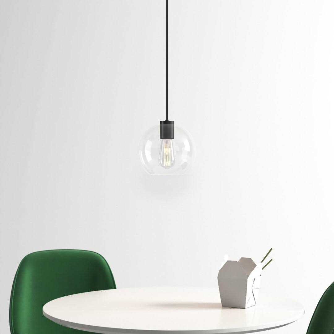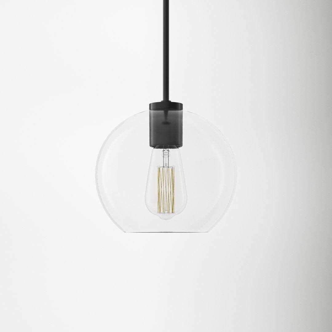 A smooth blend of mid-century + industrial elements, this pendant light’s clear glass globe shade hangs at an adjustable height from steel hardware with a black or satin-brass finish. It’s dimmable and suitable for damp locations. Add a filament bulb to play up the vintage-inspired vibe.