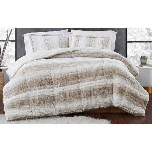 Face is 100% Carved Pv Fur Reversing to Velvet. Filled With 100% Polyester. Includes one king comforter (104×90 inches) and two king shams (20×36 inches) Face is 100% carved PV fur reversing to velvet. Filled with 100% polyester for a lightweight yet warm comforter. A faux fur face and back winter weight comforter. The face of the comforter uses a 100% polyester knit in a snow leopard pattern with cut out trimming for extra texture. It reverses to a 100% polyester velvet. The 100% polyester filling provides an extra layer of warmth for long winter nights. Digitally printed sets allows for saturated colors that combine in endless beautiful hues Fashion bedding and home decor from the ever fabulous Christian Siriano New York home collection.