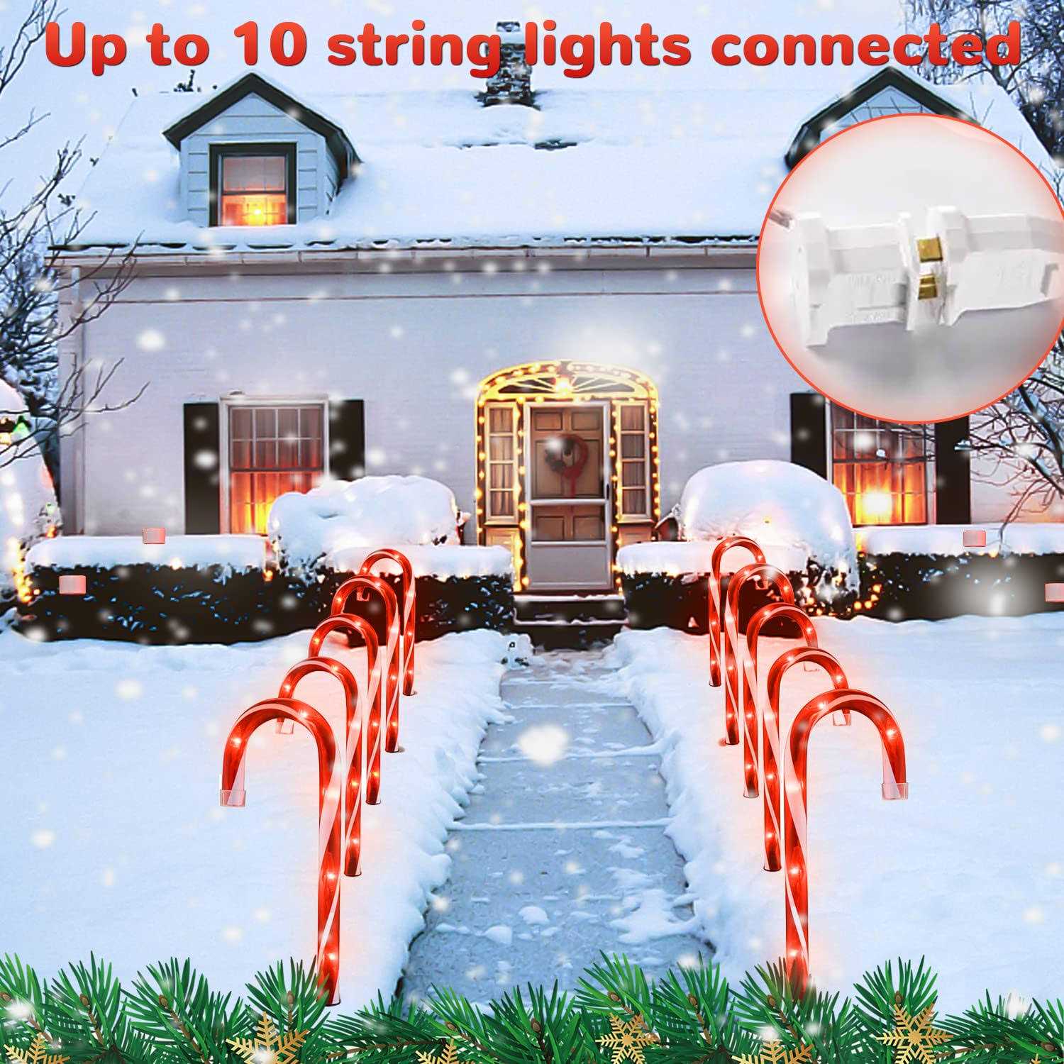 String Lights by Joascher. Details:【Specification】The candy cane light is 10 inches tall; The stake is 3.54 inches; Total length is 11.3ft; Distance between each cane is 12.6 in. Built-in 5 bulbs in each candy cane. Total 10 candy cane lights.