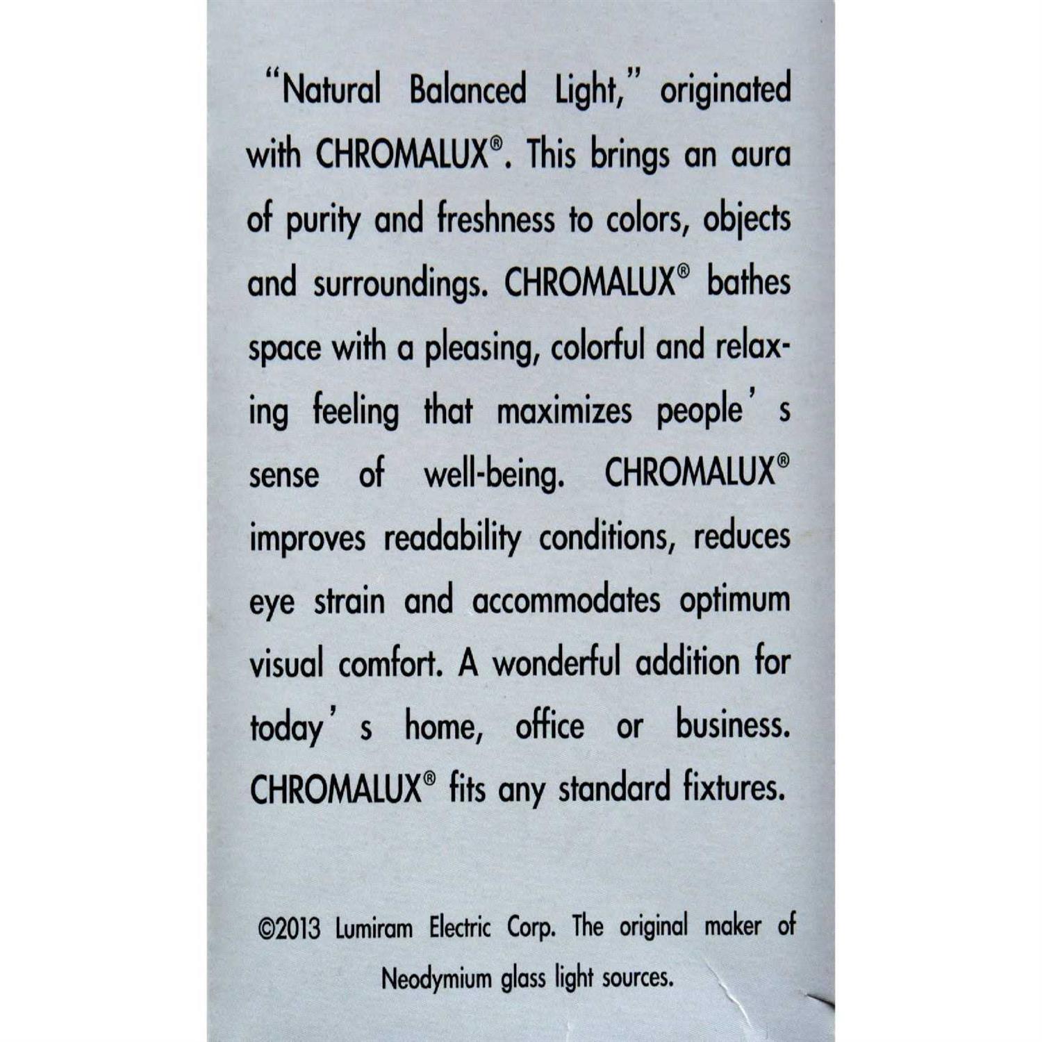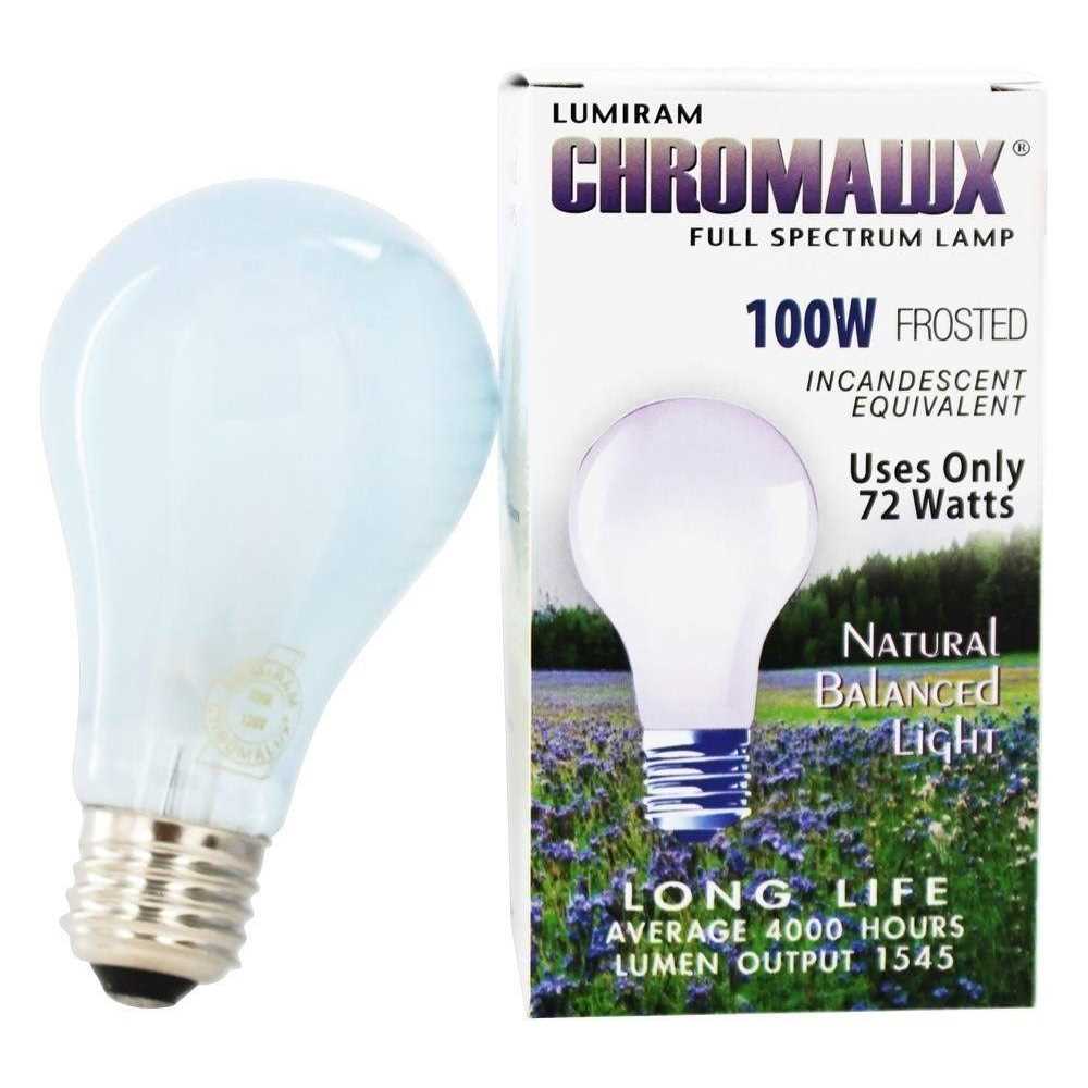 Chromalux light bulb frosted-100w – 1 bulb chromalux light bulb frosted-100w description: chromalux lumiram full spectrum lamp a21 100w frosted bulb natural balanced light long life – average 5000 hours chromalux light bulbs are long-life light bulbs that offer full spectrum lighting which closely imitates natural daylight reduces yellow glare increases black and white contrast improves readability lessens eye strain and helps promote a sense of well-being. The pure light from scandinavia the chromalux bulb has its origin in finland land of the midnight sun where life must be sustained in almost total darkness for a few months of the year. Extensive research and testing there resulted in the design of this unique light source which closely simulates natural sunlight. Natural balanced light originated with chromalux. This brings an aura of purity and freshness to colors objects and surroundings. Chromalux bathes space with a pleasing colorful and relaxing feeling that maximizes people’s sense of well-being. Chromalux fits any standard fixtures. Facts on chromalux: mimics natural light enhances reading comfort reveals natural colors and textures promotes well-being lasts longer natural balanced light long life average 5000 hours chromalux full spectrum lamps instantly create a people-pleasing oasis of pure natural light in living and work space. Disclaimer these statements have not been evaluated by the fda. These products are not intended to diagnose treat cure or prevent any disease.