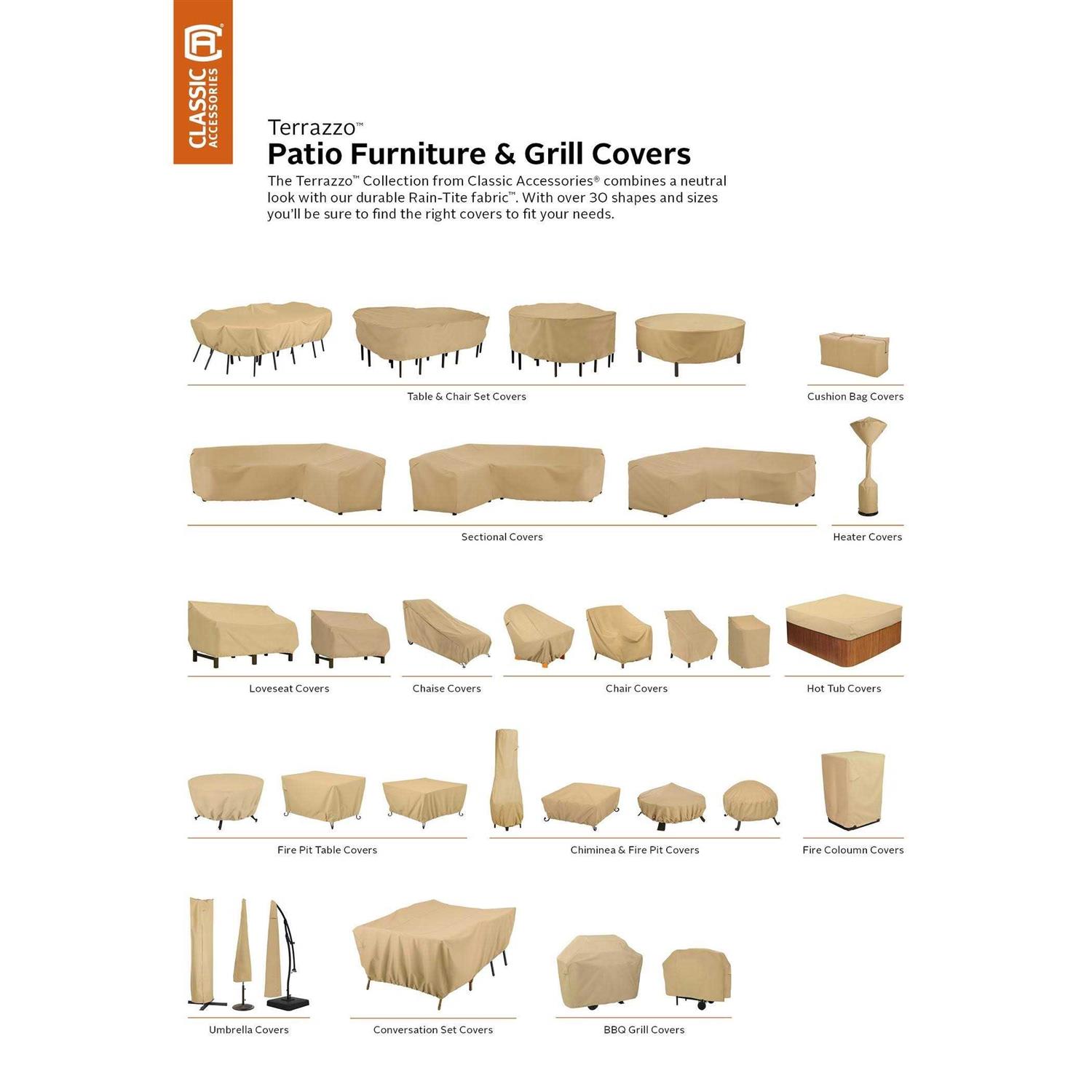 The Classic Accessories Terrazzo Umbrella Storage Cover 58902-EC offers a high-end style in medium weight protection. It is designed to keep your patio umbrella looking its best year round. The Rain-Tite fabric protects against rain, snow and dirt. The sand patio umbrella cover will not crack in cold weather, so it’s ideal for winter storage. Each cover comes with air vents to reduce inside condensation and wind lofting, which will help ensure your umbrella stays safe and secure. The Classic Accessories umbrella cover has an elastic hem cord to create a custom fit for your umbrella. Elastic Cords hem cords provide a fast and easy way to store your umbrella. It is designed to fit most patio and market umbrellas. This is a smart choice to help keep your patio furniture intact through the winter. The woven polyester fabric will help to protect your umbrella.