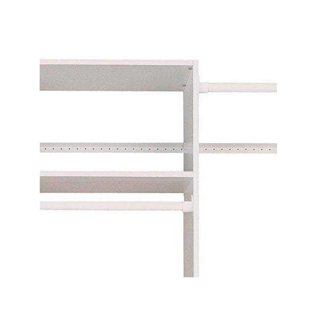 Includes 1 adjustable hanging rod, five 24 in. W x 14 in. D shelves and 2 vertical panels. Wall-mounted system hangs on a steel track, keeping everything up and off of the floor. Easy, do-it-yourself installation with hardware included. Durable, thermally-fused laminate surface. H x 25.125 in. W x 14 in. D.