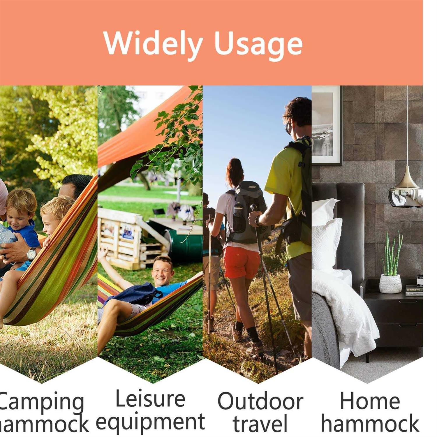 【High Quality Hammock】The camping hammock made of cotton canvas, load Capacity Up to 450 Lbs. Hammock display size: 98 inches long x 59 inches wide, bed size: 73 inches long x 59 inches wide. The hammock can be used in a hammock stand or tree with a length of 8.5-10 feet. 【 Anti Rollover Design 】 The end of the hammock has 9 ropes tied into knots, preventing the end of the hammock from breaking and falling off in a short period of time. It can effectively tighten the hammock and maintain its balance, allowing you to enjoy leisure time. 【Widely Usage】The cotton canvas hammock comes with a compact carrying bag, suitable for you to entertain and relax in the park, seaside, mountain, terrace, porch, garden, courtyard. 【Easy to Install】Equipped with 2 metal carabiner, two tie ropes and 2 wide belts with steel loops at one end, you can attach the hammock to a hammock stand or hang it to two trees. It only takes a few minutes to install the hammock.