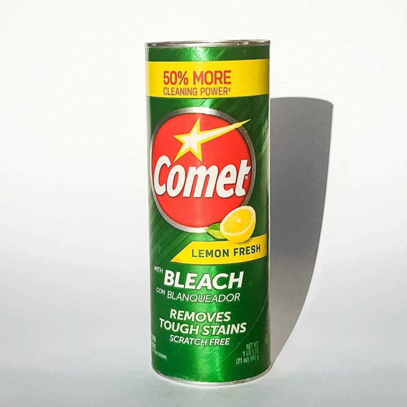 - Comet with bleach helps you get tough on stains, cuts through soap scum and mildew stains