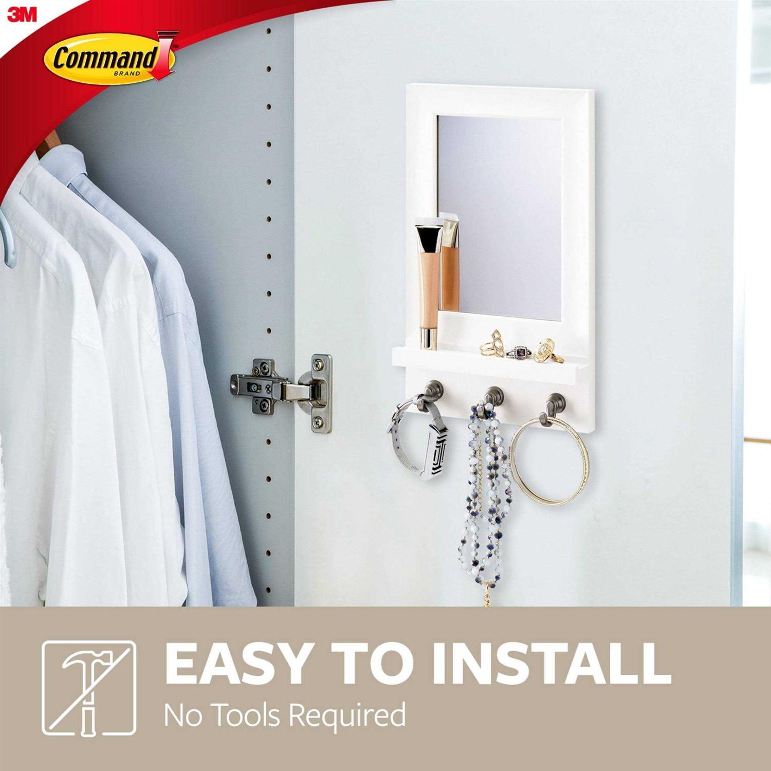 The Command Mirror Organizer makes it easy for you to check you appearance on the way out the door. Corral keys and lanyards on the hooks, and the small ledge holds items like lipgloss or outgoing mail. The Command Mirror Organizer is simple to hang no tools required! Using the revolutionary Command Adhesive, the Command Mirror Organizer holds strongly on a variety of surfaces, including paint, wood, tile and more. Yet, it also comes off cleanly no holes or sticky residue providing a great alternative to damaging screws and nails. Reusing our small hanging mirror is as easy as applying Command Refill Strips, so you can take it down, rearrange and reuse again and again!