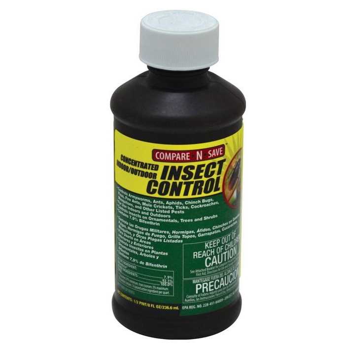 Control insects indoors and outdoors with Compare-N-Save 7.9-percent Bifenthrin concentrate indoor and outdoor insect control. This insecticide can be tank mixed with other pesticides, including insect growth regulators. The 8 oz. container will treat up to 44,000 sq. ft.