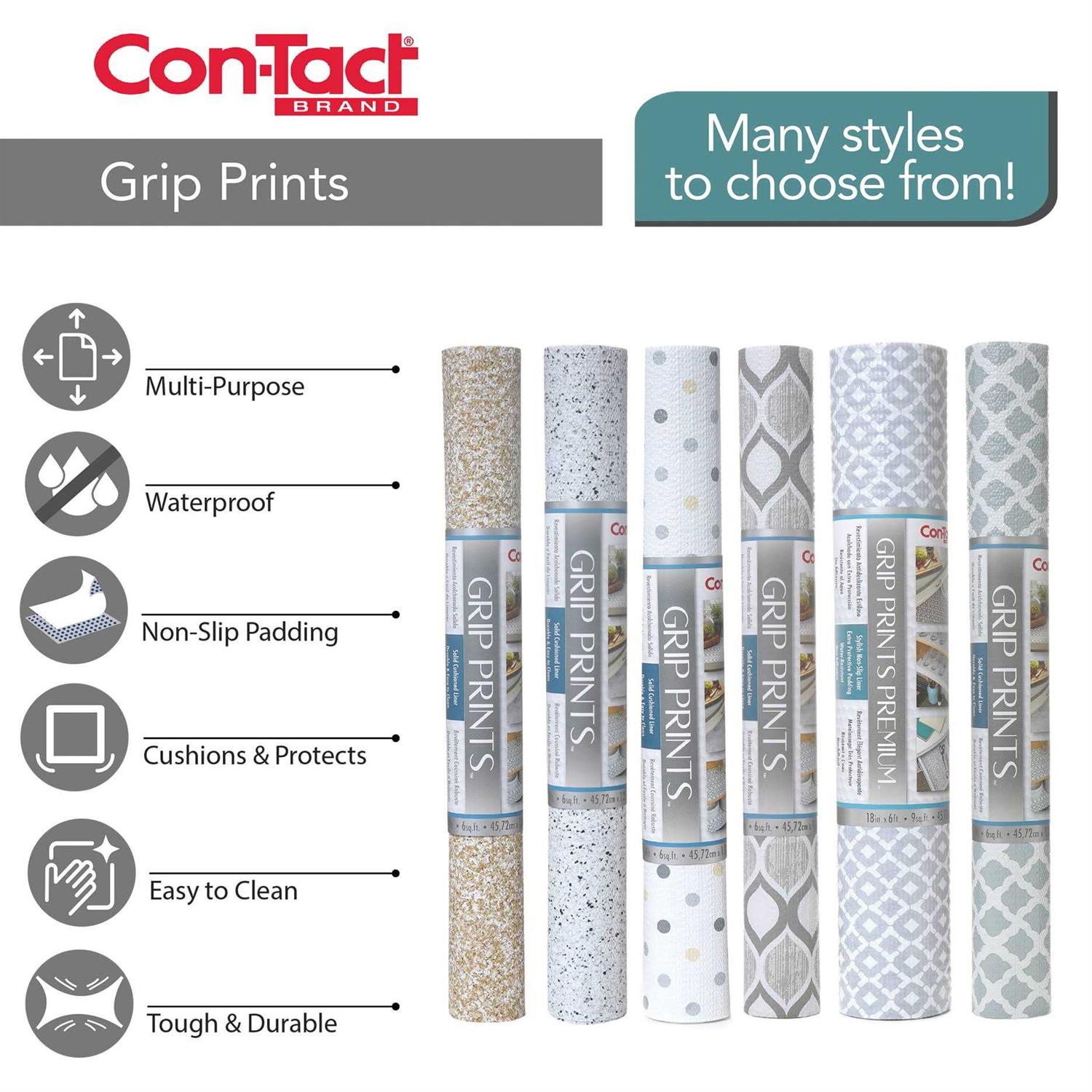 Shelf Liners by Con-Tact Brand. Details:Description Con-Tact Brand’s Non-Adhesive Grip Prints Shelf Liner offers a smooth, washable and water-proof surface, is durable and protective and the cushioned grip backside stays firmly in place without adhesives. Con-Tact’s Grip Prints, Non-Adhesive Shelf Liner works as a durable non-skid barrier in drawers and shelves to keep utensils and dishes neat and secure while offering a clean finish to your storage space. Con-Tact Brand’s Grip Prints Liner combines decorative patterns with the durable, cushioned grip liner to keep it in place without an adhesive backing. The decorative vinyl provides a smooth, water proof surface to help preserve shelves. Grip Prints is also stain resistant and washable by wiping clean with warm water and mild soap. These decorative grip liners add personality and style to any kitchen furnishing, office desk and tabletop. Grip Prints come in a variety of over 21 patterns of floral, modern, fruit, and classic as…