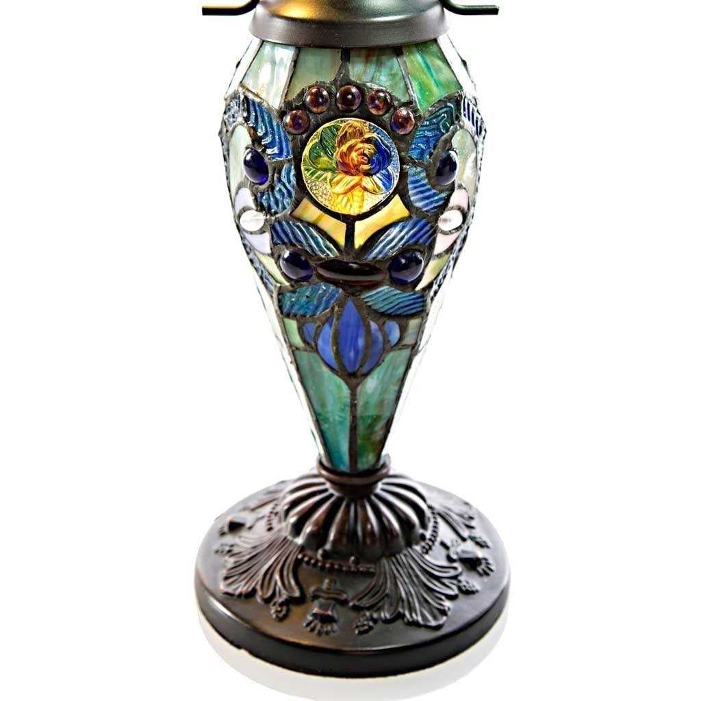 Illuminate your space with the intricate Copper Grove Glenbow Tiffany-style stained glass lamp. This double-lit table lamp features a polyresin and metal base, adorned with a traditional stained-glass and copper-foiled shade made of 303 hand-cut glass pieces and 116 cabochons for added shine and durability. Choose from amber or blue color schemes and enjoy maximum illumination with its 3-way lighting. The lamp requires two 60-watt bulbs and one 7-watt bulb, with separate pull chain switches for the shade and an inline switch for the base. With a 66-inch cord, UL listing, and measuring 26 inches high x 18 inches in diameter, this handmade lamp is sure to add a touch of Victorian elegance to any room. Features: Polyresin and metal base Stained glass and copper foil shade Traditional, Tiffany style Amber or blue color scheme Handmade 3-way lighting Requires 2 60-watt bulbs and 1 7-watt bulb