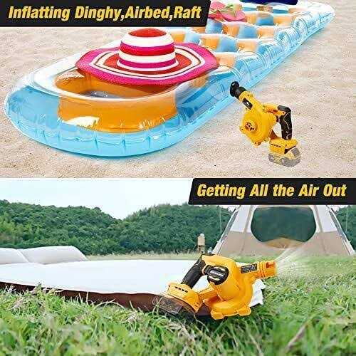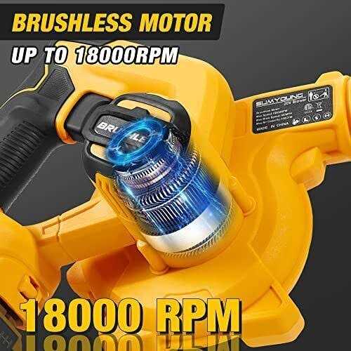 Brand: SUMYOUNGFeatures: ️ ️ ️Pay Attention! Tool only,No battery! This electric blower is just compatible with DEWALT 20VMax Battery,NOT DEWALT Blower. 【Low-voltage Protection】 Built-in low-voltage protection and over-current protection, which can well protect your precious DEWALT batteries from damage. You can use our machines to your heart’s content. When your DEWALT battery voltage is too low, the machine will automatically power off. You can save money on the DEWALT battery and charger if you already have them. 【High Preformance Brushless Motor】Different than other blowers. Our leaf blower equipped with high-efficiency brushless motor up to 18000RPM which has higher performance and longer motor life.Can better stimulate the function of the DEWALT battery. 【2-in-1 Blower & Vacuum】 2 in 1 design makes electric leaf blower & vacuum can be switched at will, just enjoy the flexibility and versatility of this cordless leaf blower. It’s not only a leaf sweeper, but also a multifunctional dust & pet hair cleaner, car blower, inflator for camping,boating or floating,also awesome for getting all the air out. 【6 Adjustable Speeds】Cordless leaf blower can provide you with 6 adjustable speeds, up to 180MPH and down to 70MPH, which can help you easily switch from outdoor to indoor work for all scenarios. 【Various Accessories】Our leaf blower set including Flexible Pipe, Dust Collect Bag, Small Suction Nozzle, Large Suction Nozzle, Extension Tube, 2*Genetal Tube, Inflatable Nozzle. You can finish a lot of work with our blower. EAN: 0714955394021Package Dimensions: 13.5 x 7.6 x 7.0 inches
