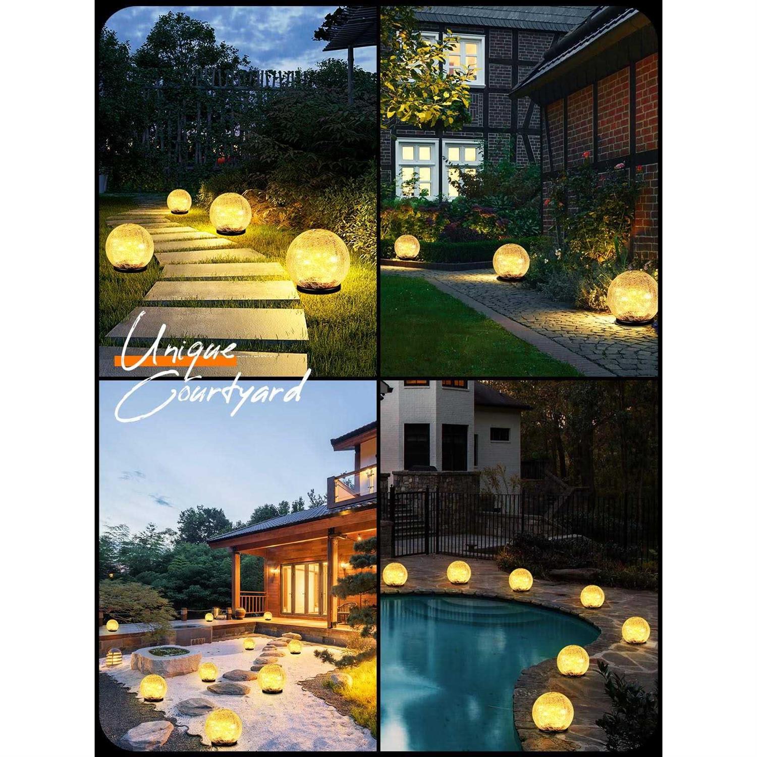 Solar Powered & Auto On/Off: Solar energy supply, no extra utility electric cost, and no need to replace the battery. Light sensor controls the solar patio lights charging at daytime and auto on at dark.It only needs 6-8 hours to be fully charged and can last for 8-10 hours working time. PS:Make sure expose it to the sunshine for 6 to 8 hours to fully charge before using it. Solar Garden Lights Outdoor Decorative: Compared with traditional ball lights, this beautiful outdoor decorative solar lights designed with cracked ball, when it turn on at night will looks like a big diamond shining.This solar globe lights will decorate your room and garden with a romantic sentiment. It is a great holiday decoration and kids gift idea. Premium Material: The solar garden lights are made of thick crackle glass globe, cracked glass is like a beautiful crystal ball. It adopts high quality LED lamp beads, built-in LED copper wire lamp, has a soft and warm light, the bulbs shine like many little stars so warm and so bright, creating a romantic and relaxing atmosphere, bringing you a fairy-tale garden. IP65 Waterproof: The LED solar ball lights are suitable for outdoor, which can withstand harsh weather such as outdoor wind, rain and snow, and maintain normal operation. Widely Used: garden solar lights can decorate your garden, courtyard,patio, outdoor tabletop, pool, flower bed, lawn, fence, deck, sidewalk, walkway, restaurant garden, hotel, commercial building, garden decor and more.solar globe lights outdoor can also be used as mood lighting during holidays such as parties, banquets, anniversaries, dates, festivals,weddings, Valentine’s Day, Christmas, and more!